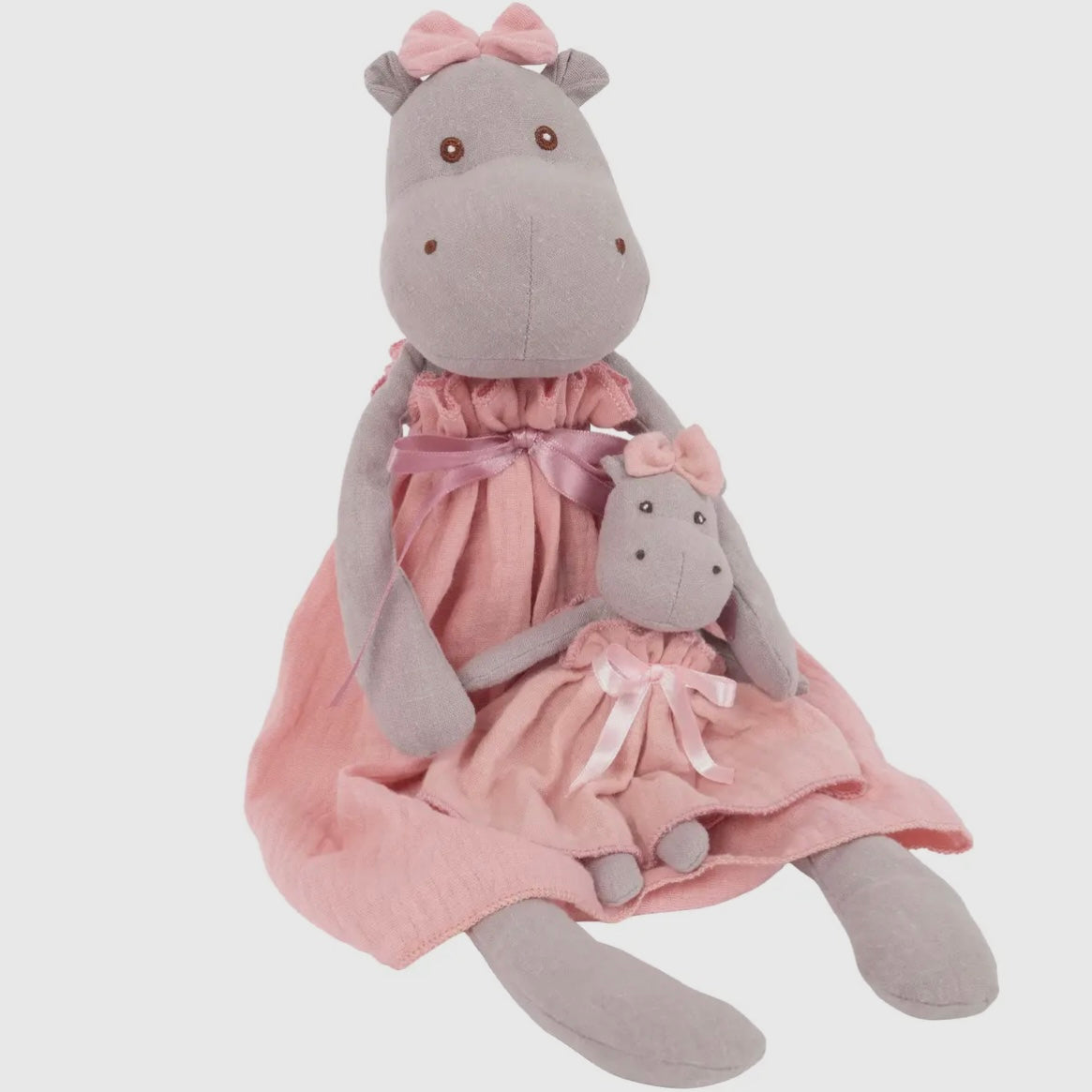 his adorable linen hippo duo features a gentle gray mama hippo in a flowing pink dress with a satin bow, lovingly holding her sweet baby dressed to match. Each is topped with a soft pink bow and has stitched eyes and gentle expressions, perfect for cozy cuddles, imaginative play, or nursery decor. Size: Mom hippo appears to be about 16 inches tall. Baby hippo is about 7 inches tall.