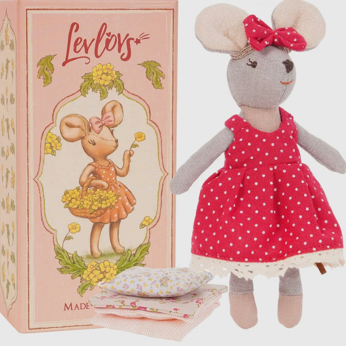 Meet Mouse Rose – A Pop of Polka Dot Joy Full of giggles and classic charm, Mouse Rose is a little blossom in the mouse family. Dressed in her cheerful red dress dotted with playful white polka dots, she’s always ready for twirls, giggles, and grand adventures. Her matching bow sits smartly atop her head, the perfect touch for a mouse with a flair for fun. Lovingly handcrafted from soft linen, Rose is both spunky and sweet — the kind of friend who brings a burst of happiness wherever she goes. She’s perfect for cuddles, collecting, or simply sitting pretty in a cozy corner.