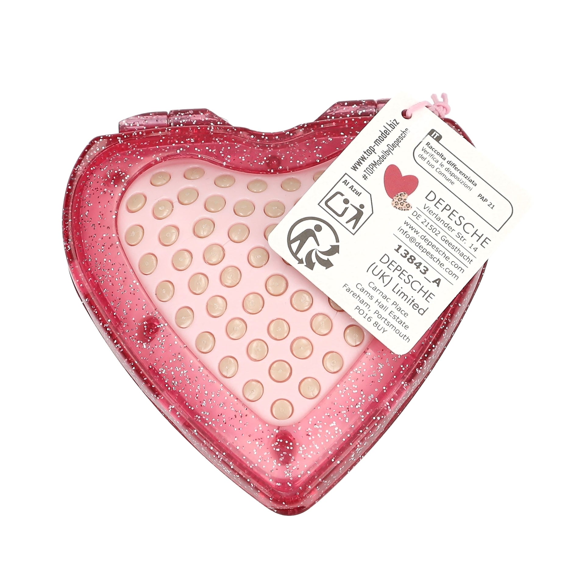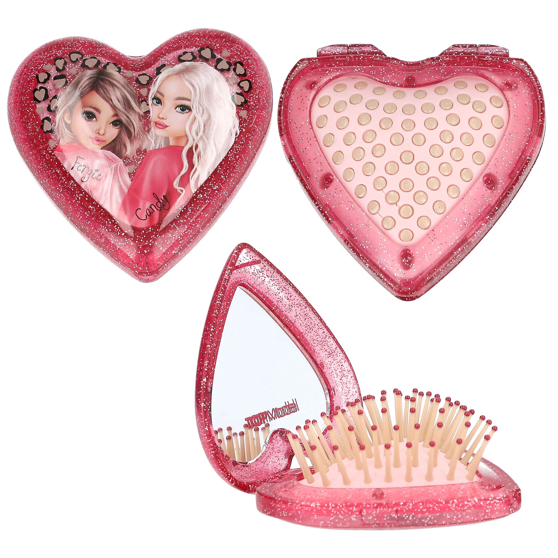 - Fold and comb: You always have the heart-shaped folding hairbrushes from TOPModel with you! Inside with a bristle cushion that stands up and a mirror, outside in transparent glittery rosé or pink and with a stylish model motif.