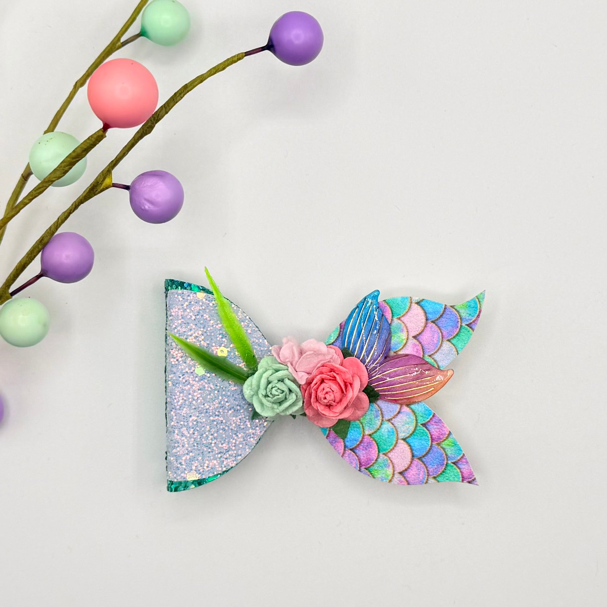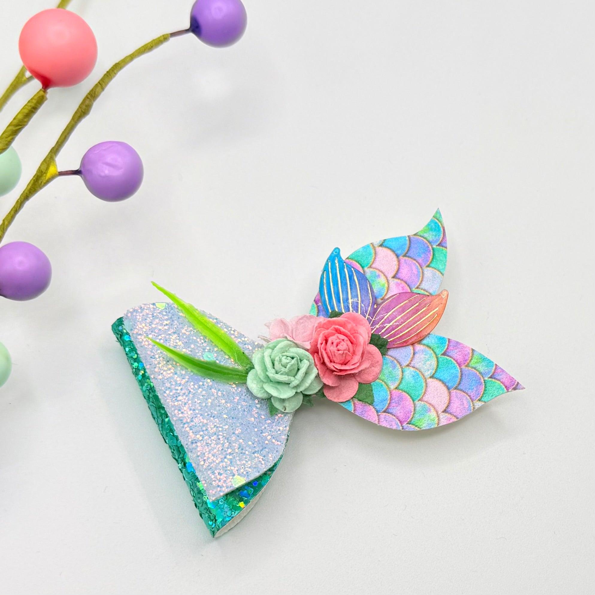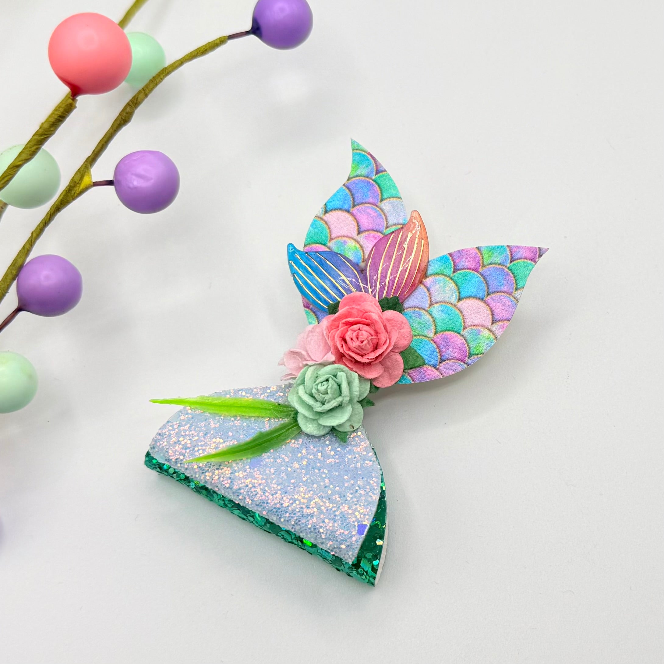 A beautiful combination of fabrics teamed with pretty flowers and the prettiest embellishment, this piece is perfect for all those little Mermaid princesses. Fitted with a crocodile clip to the underside for a secure hold. Size is approx 9 by 6.5cm.