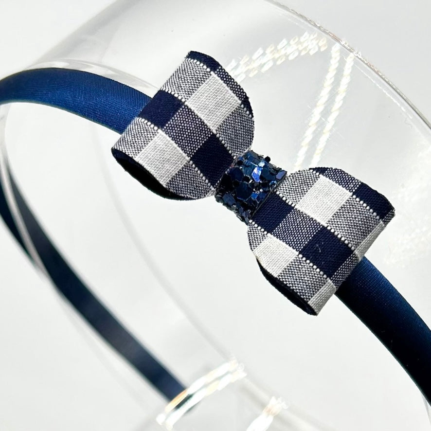 A pretty gingham effect bow attached to a , satin effect lined Alice style hair band.