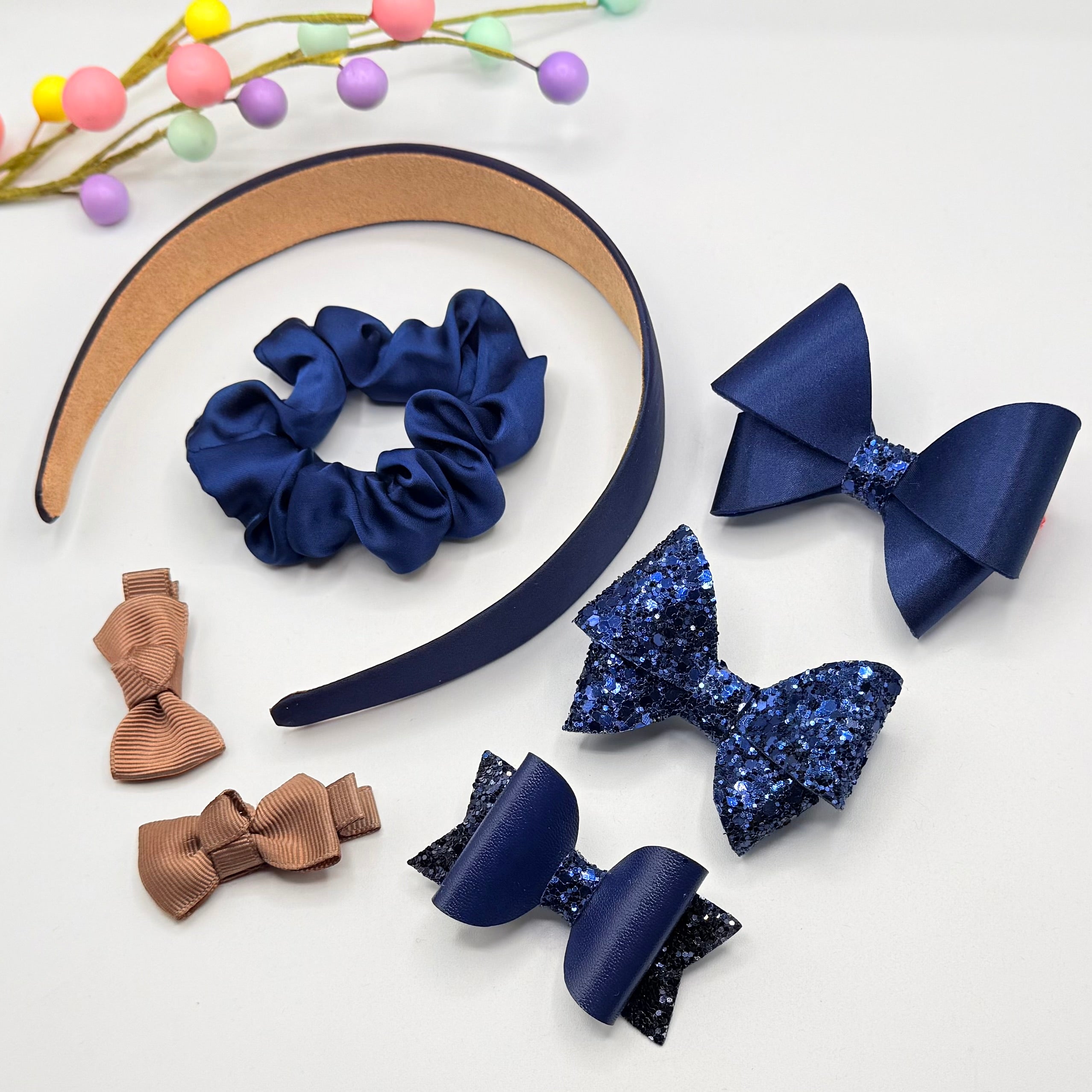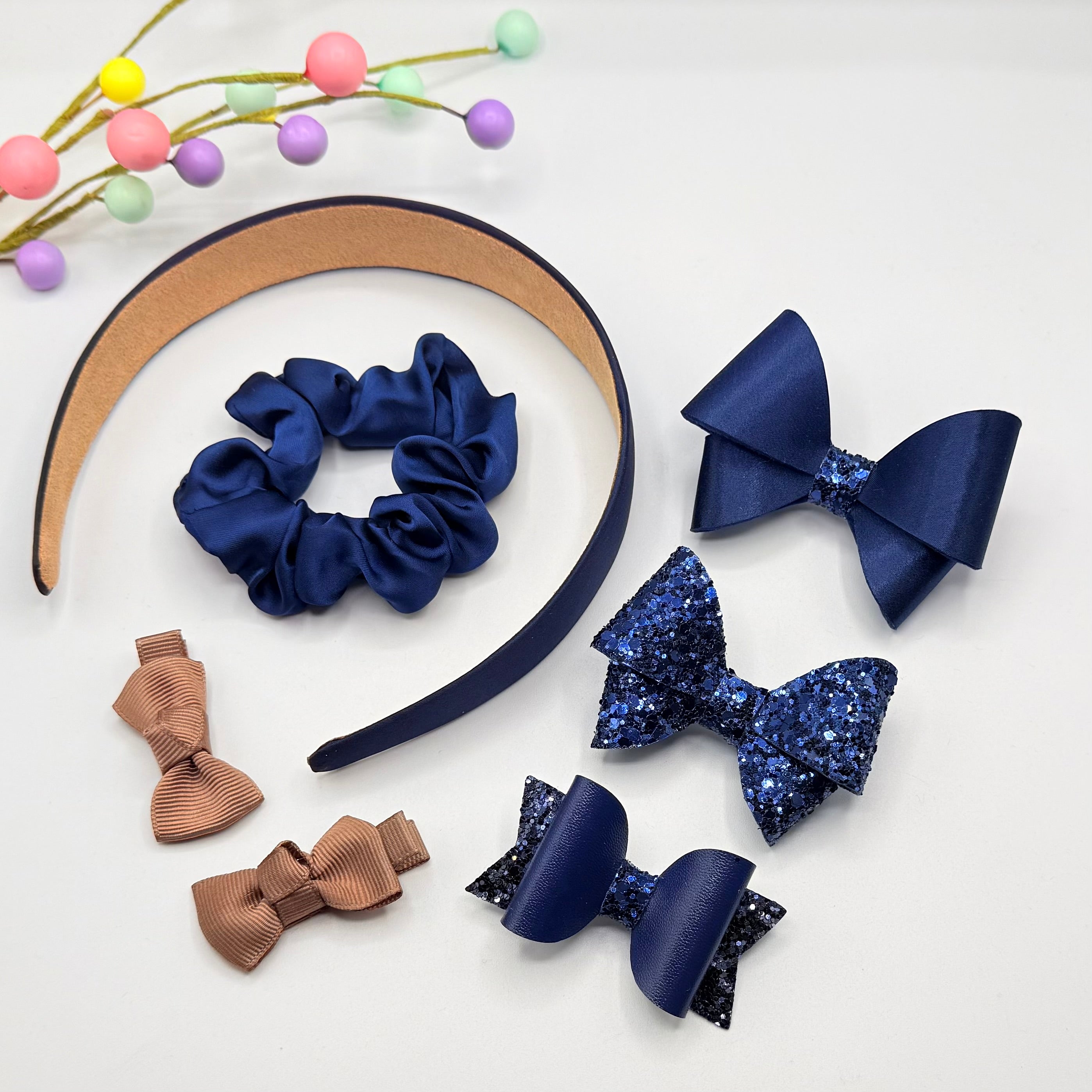 Set includes: 3 Navy hair bows, all made in wonderful shapes and pretty fabrics and fitted with crocodile style clips to the underside for a secure hold. A matching set of ribbon bow hair clips. A satin effect hair scrunchie and a great style hair band. The perfect set for all your hair goals.