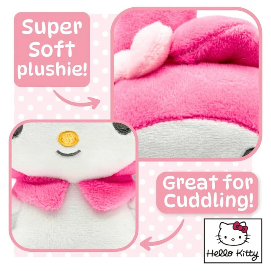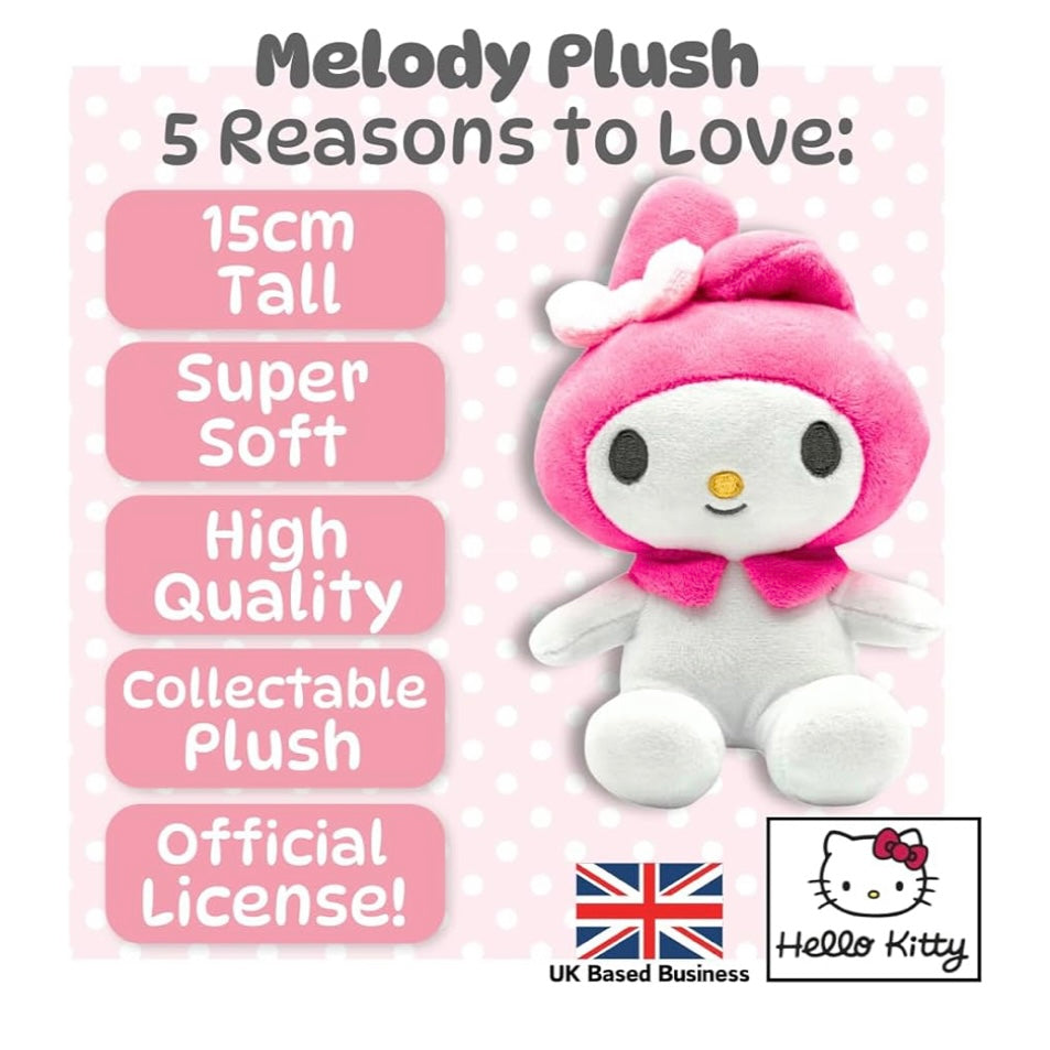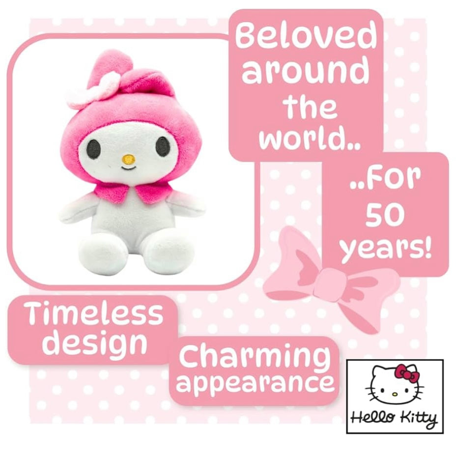 - Authentic Sanrio Design: This officially licensed 15cm My Melody plush showcases the beloved Hello Kitty character in a sweet, cuddly sitting pose. Carefully crafted from high-quality polyester fibers, it features vivid pink and white colours true to My Melody's signature look, including her charming hood and tiny bow. Perfect for Sanrio fans and collectors alike, this plush toy is an adorable way to express your love for iconic kawaii characters. Perfect Gift for All Ages.
