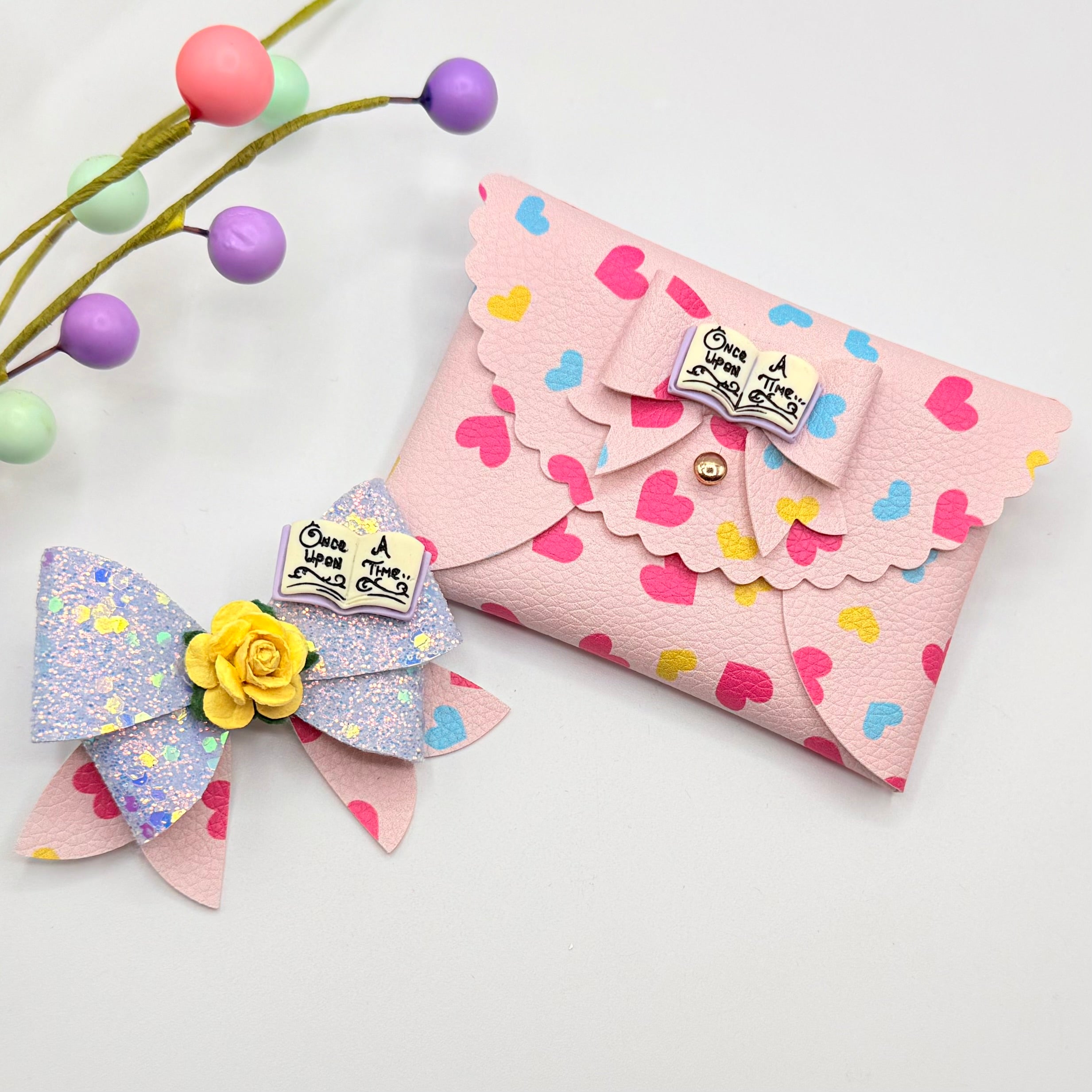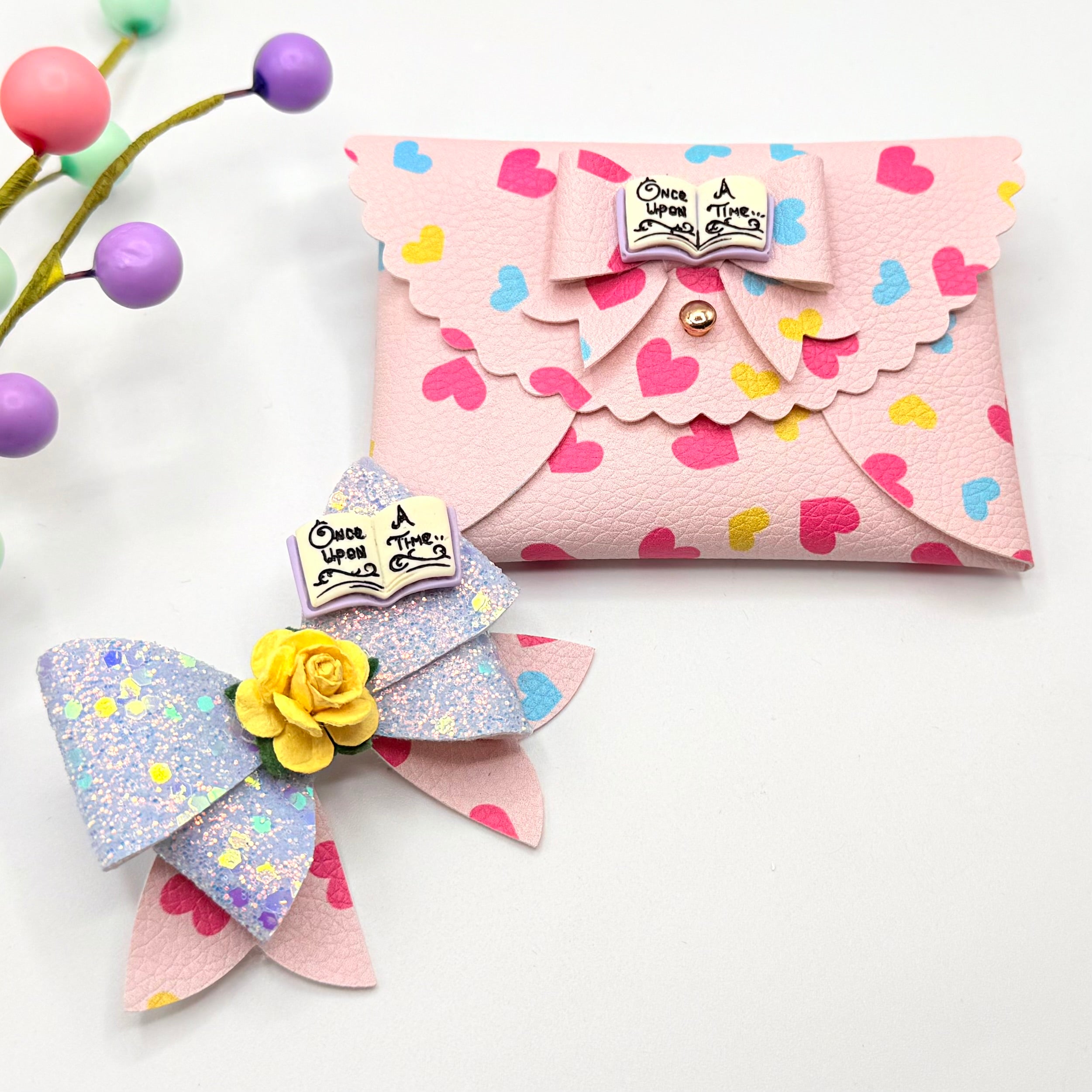 This beautiful set an easy to use pouch style purse and matching hair bow. Both with adorable fairy tale book embellishments.