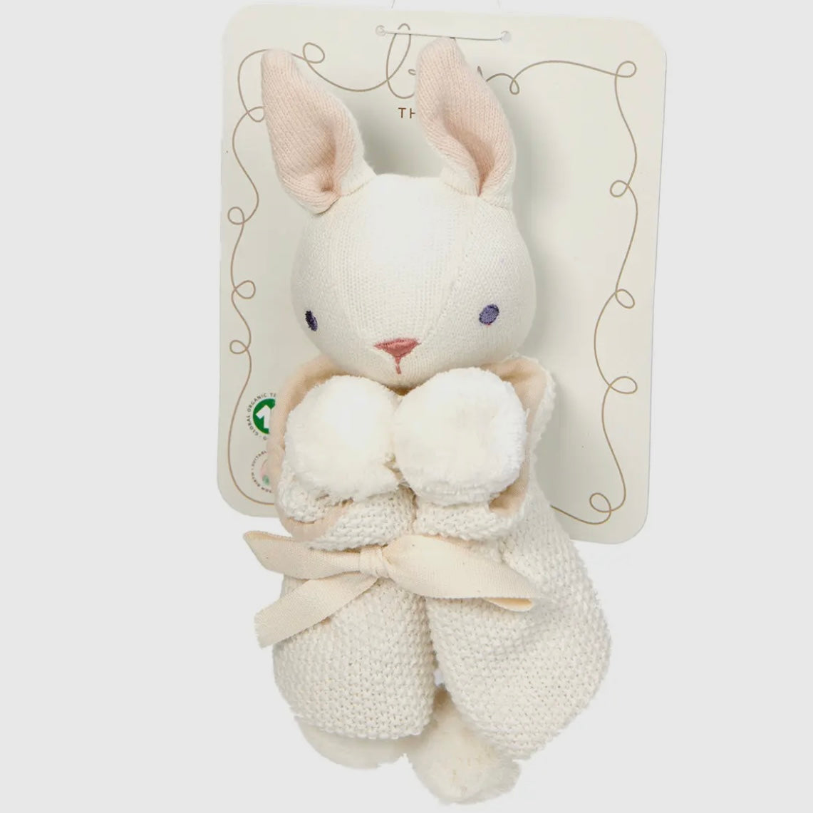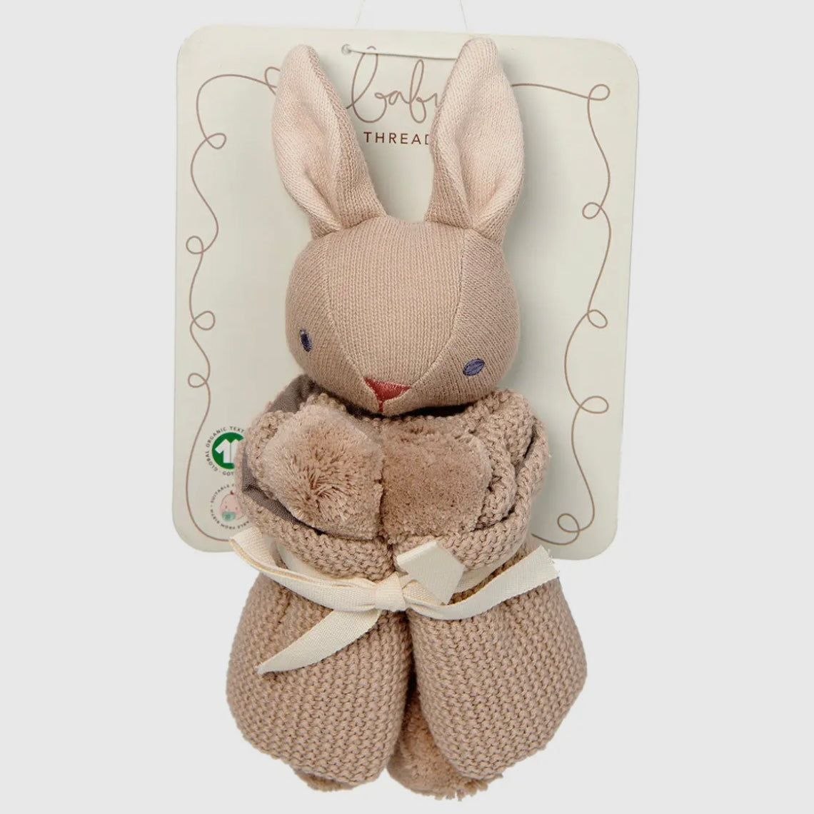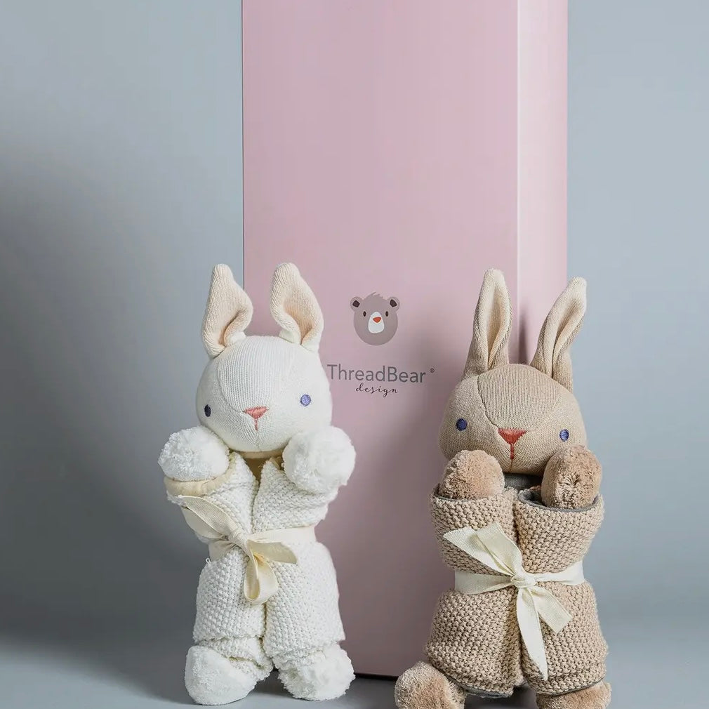 A smart pink gift box containing a cream bunny security blanket and a taupe coloured blanket. Made from the softest organic cotton yarn and finished with a lined panel and pretty pom poms. Both are presented inside the gift box on backing cards for full consumer information. The perfect gift.