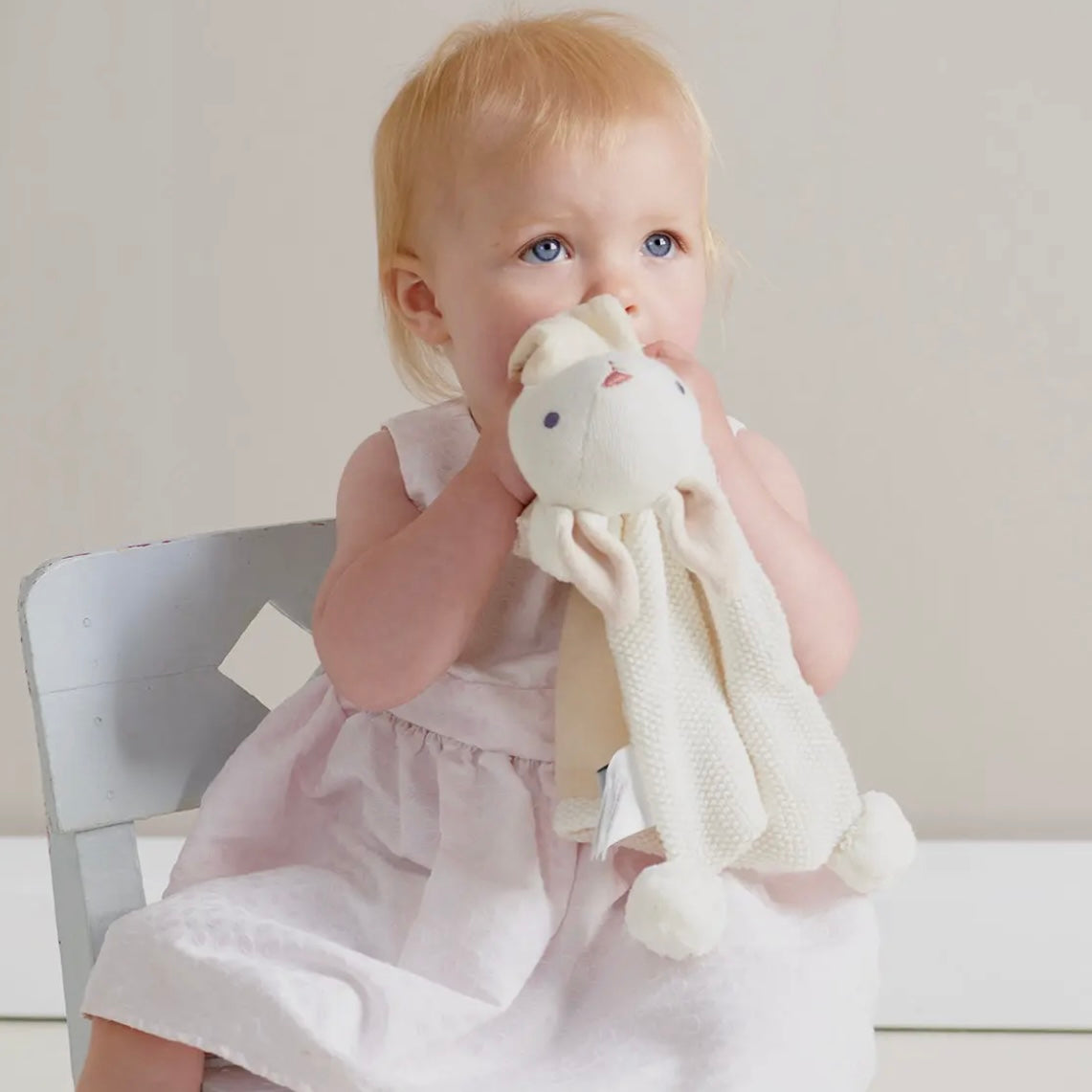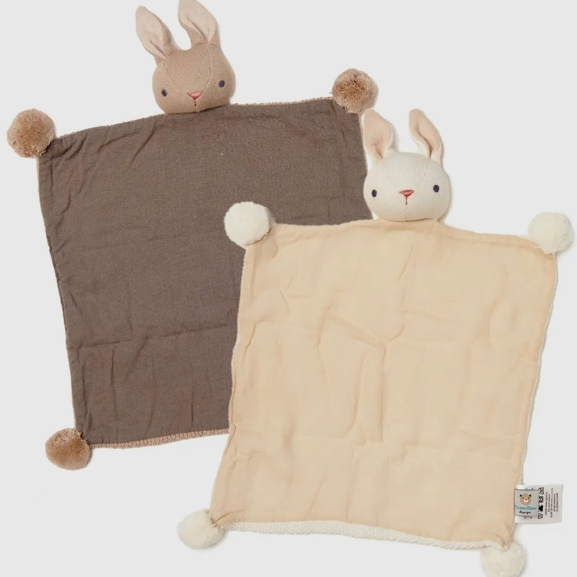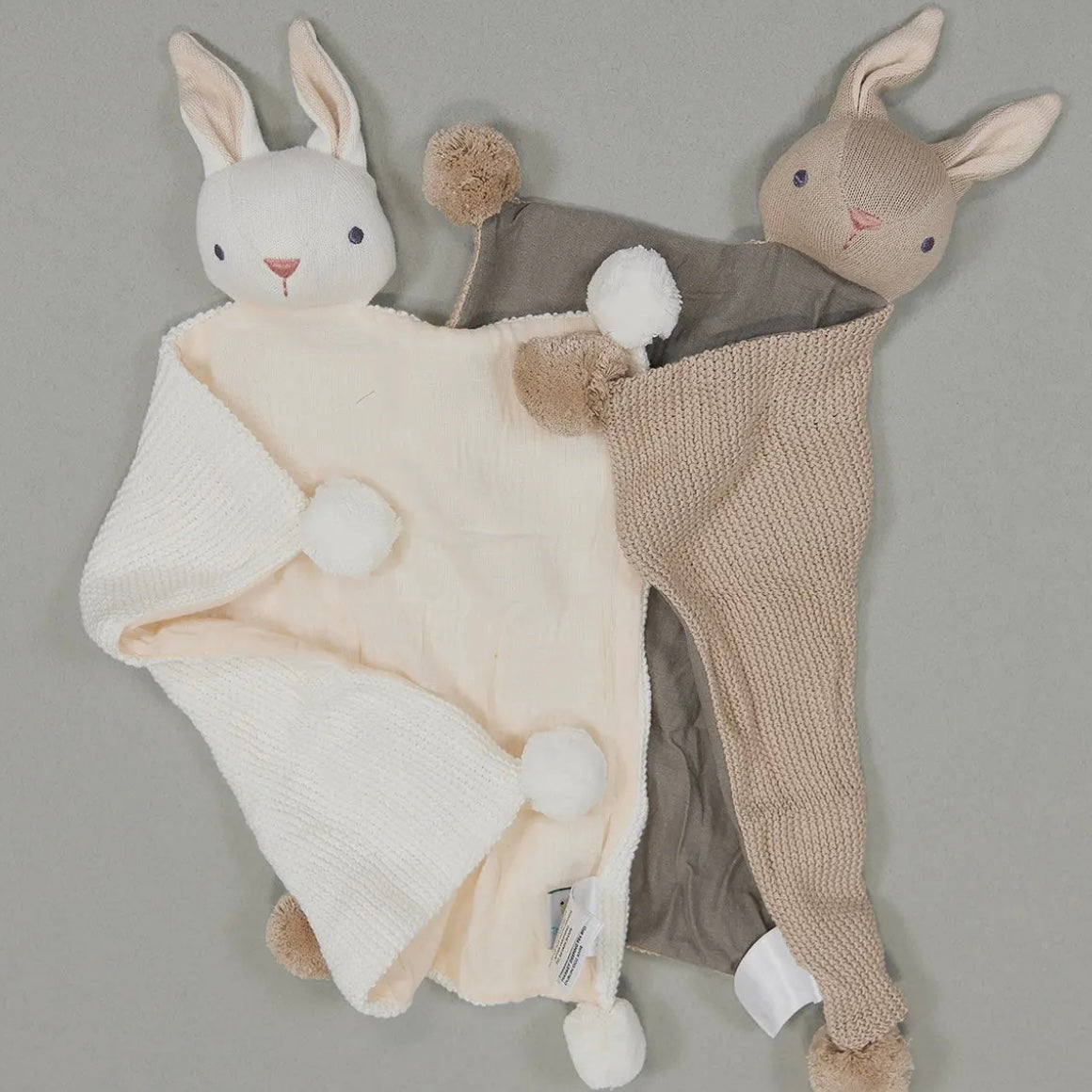 A smart pink gift box containing a cream bunny security blanket and a taupe coloured blanket. Made from the softest organic cotton yarn and finished with a lined panel and pretty pom poms. Both are presented inside the gift box on backing cards for full consumer information. The perfect gift.