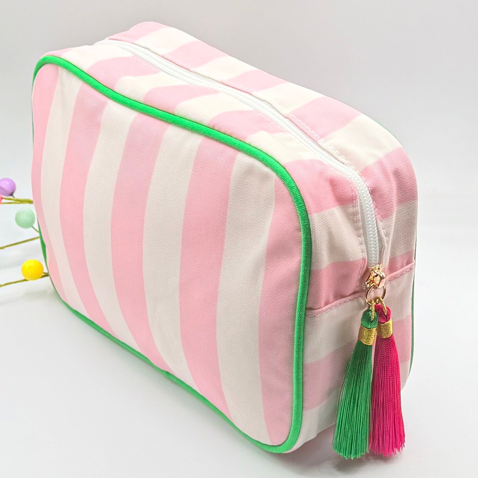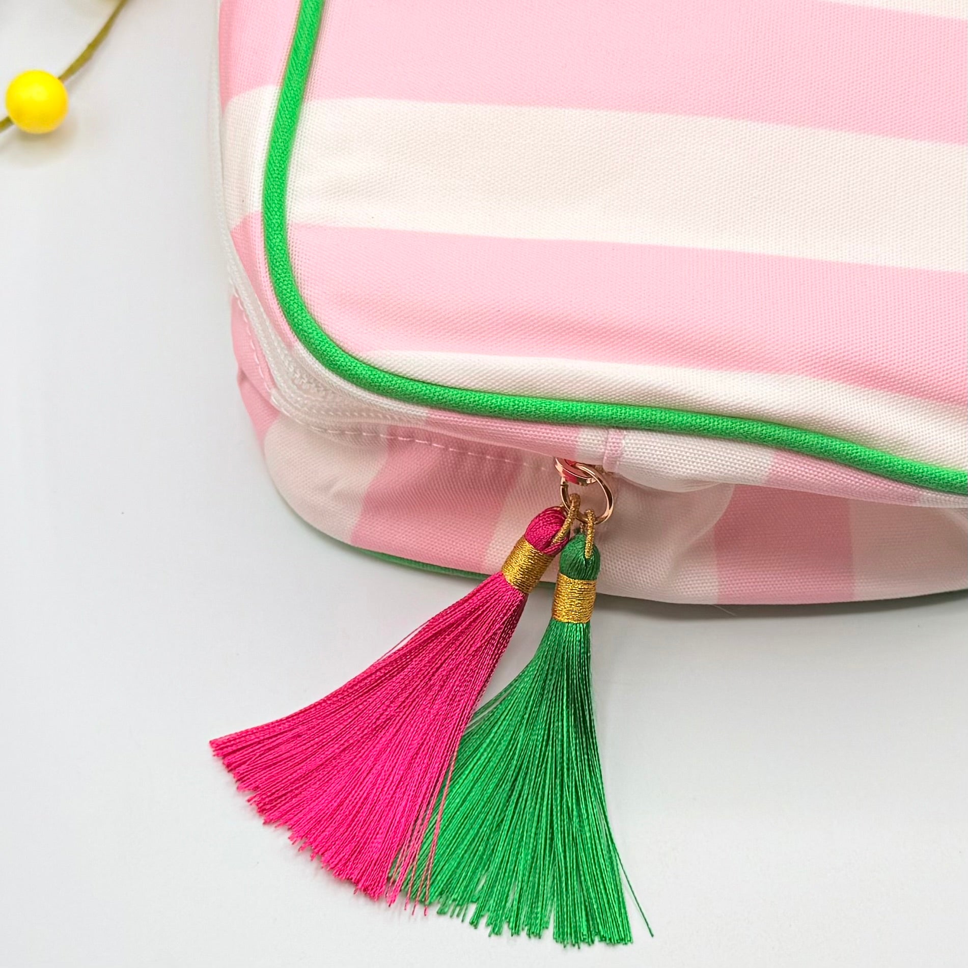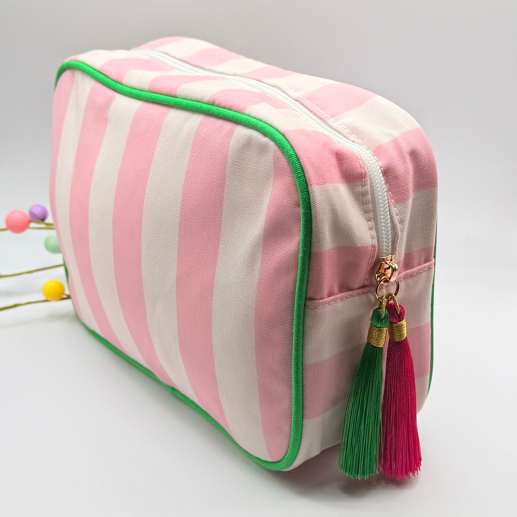 A lovely vanity bag, great for storing a multitude of products, from hair accessories, make-up any many other items. Easy zip opening & closing and finished with pink & green tassels to the zip.
