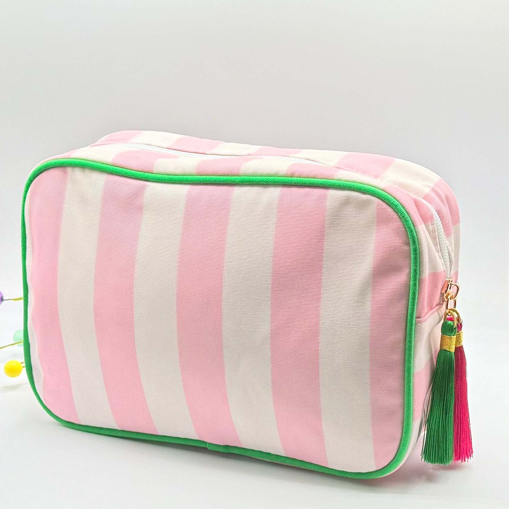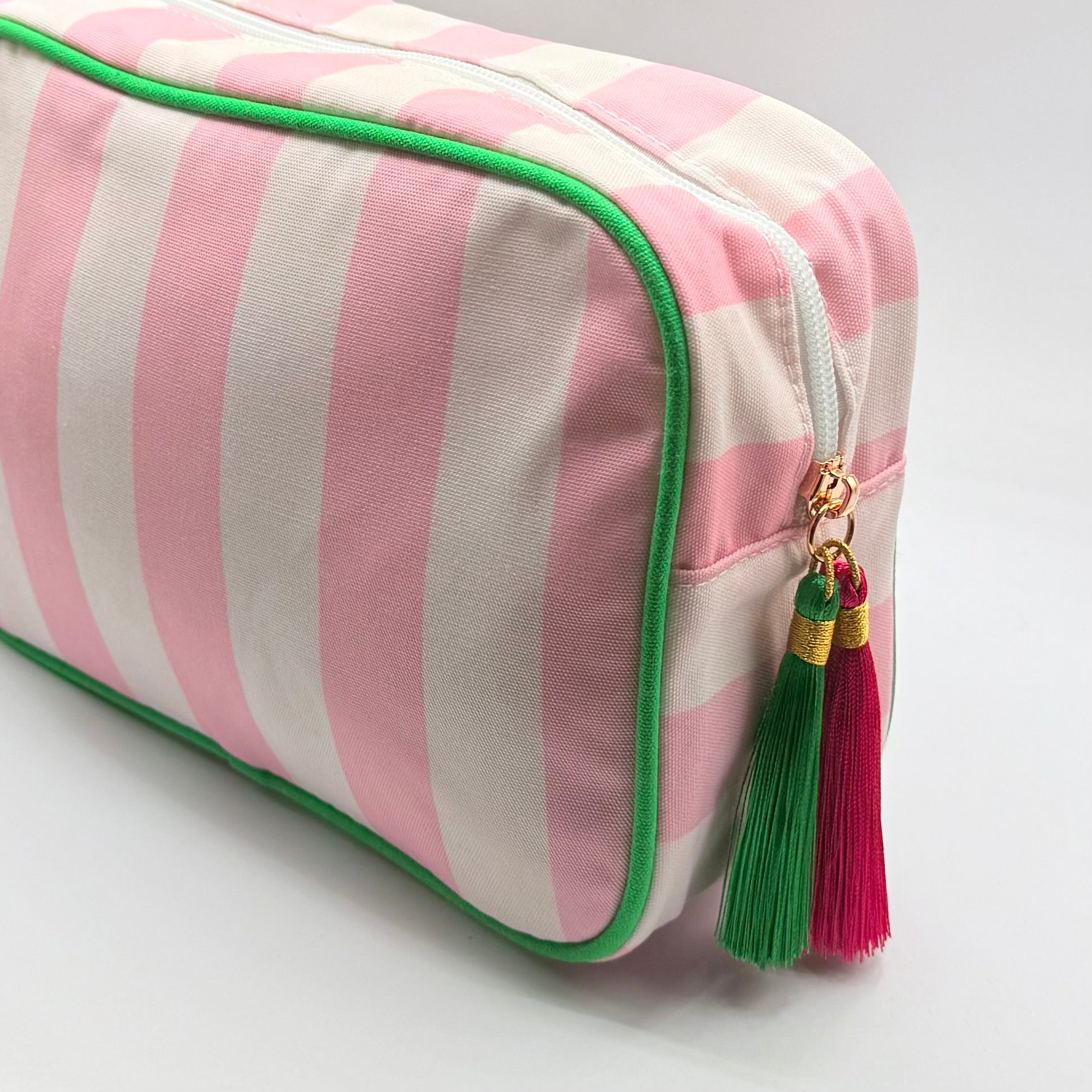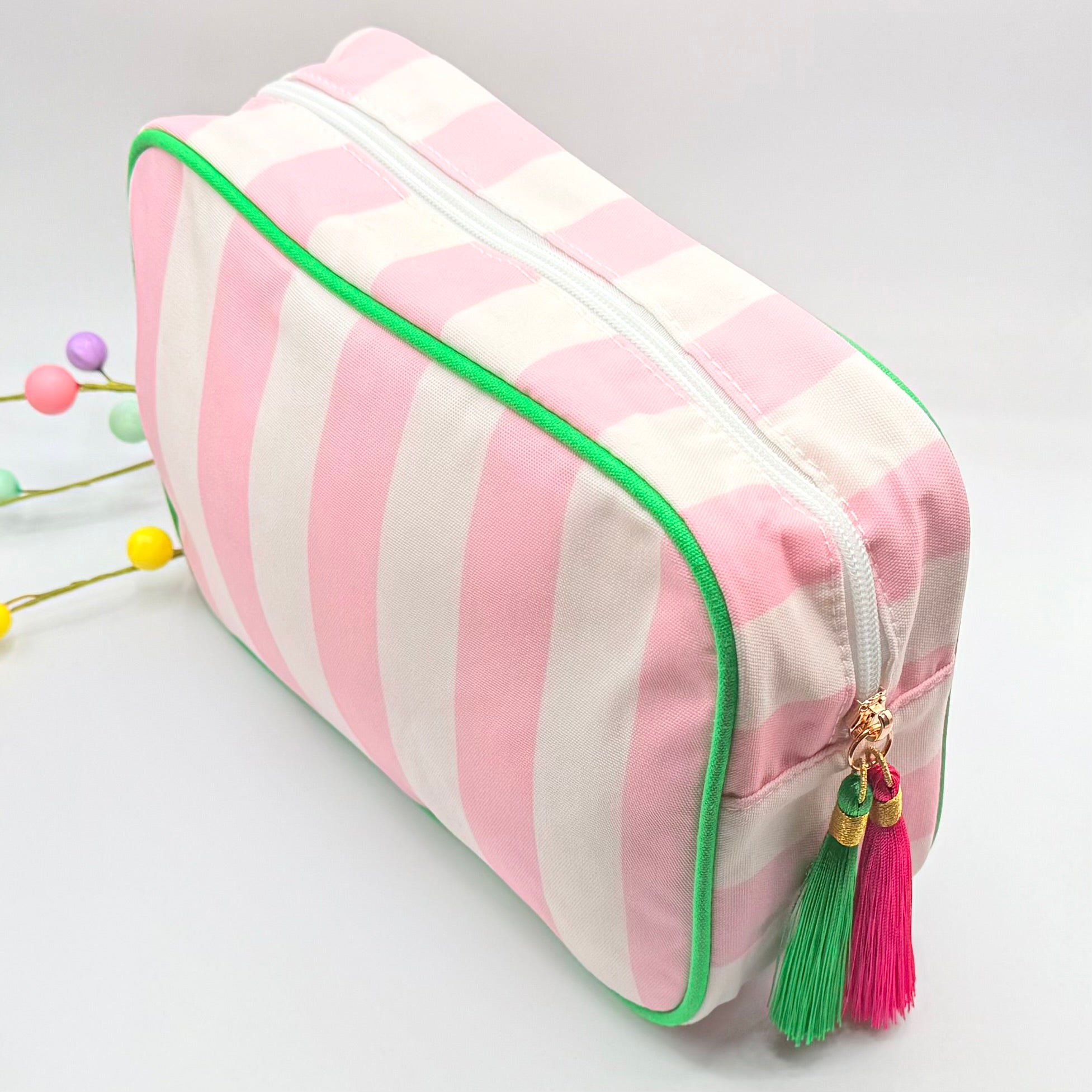 A lovely vanity bag, great for storing a multitude of products, from hair accessories, make-up any many other items. Easy zip opening & closing and finished with pink & green tassels to the zip.