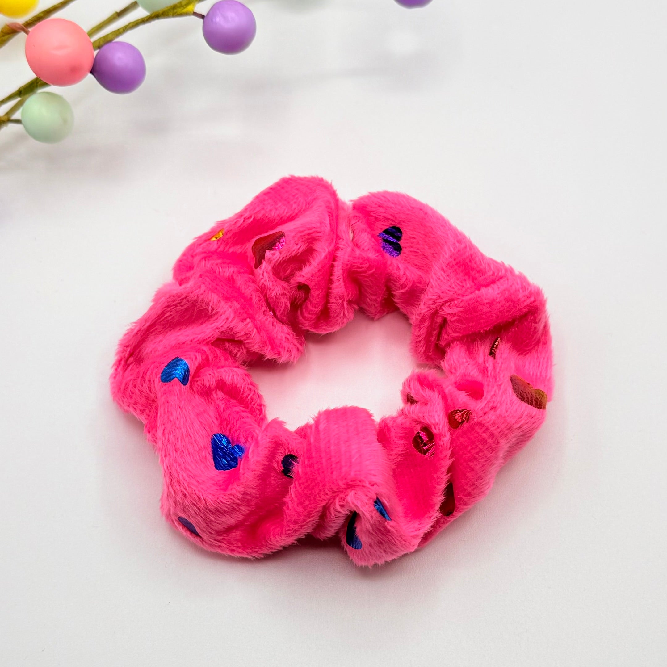 Multi coloured rainbow hearts make the pattern throughout this soft, elasticated hair scrunchie.