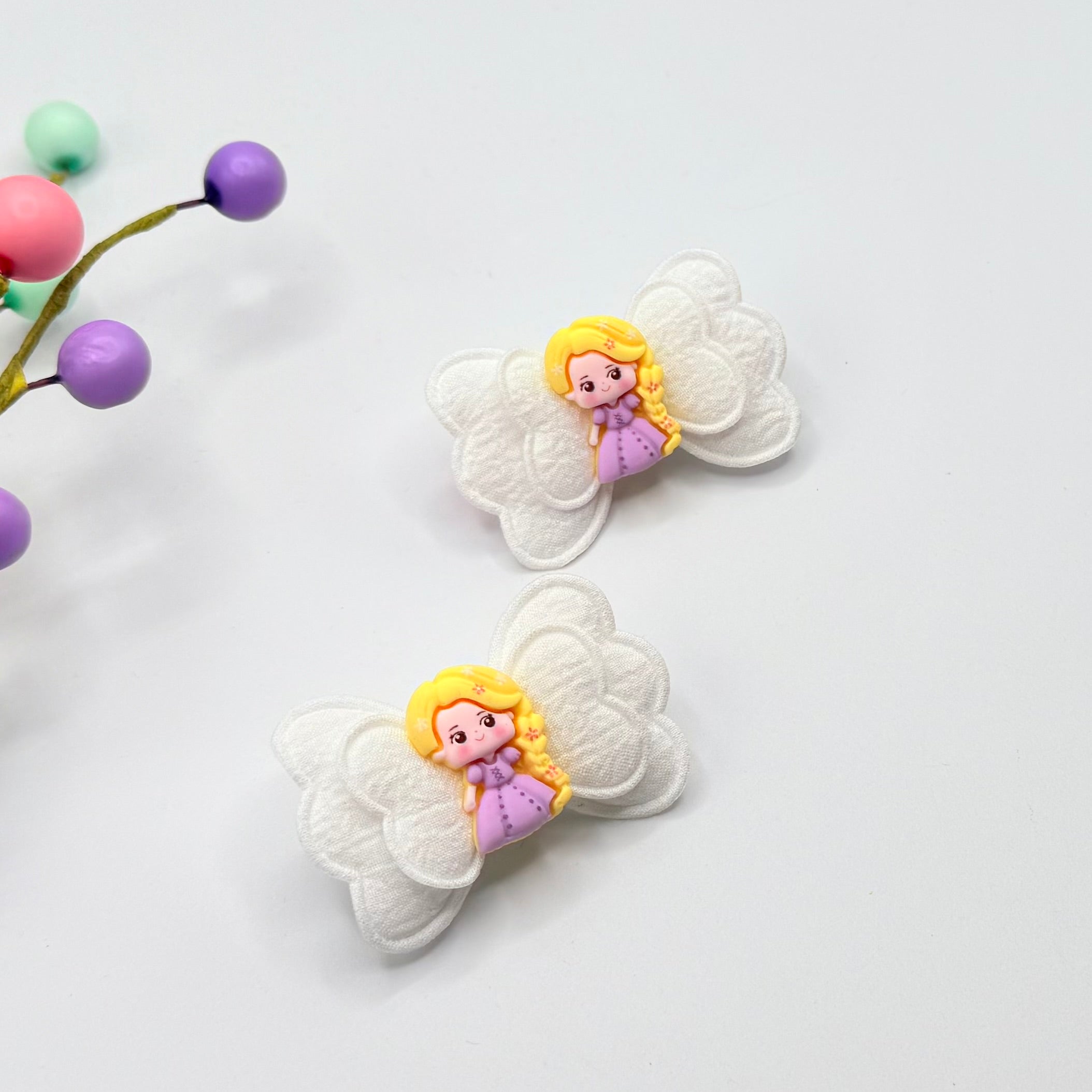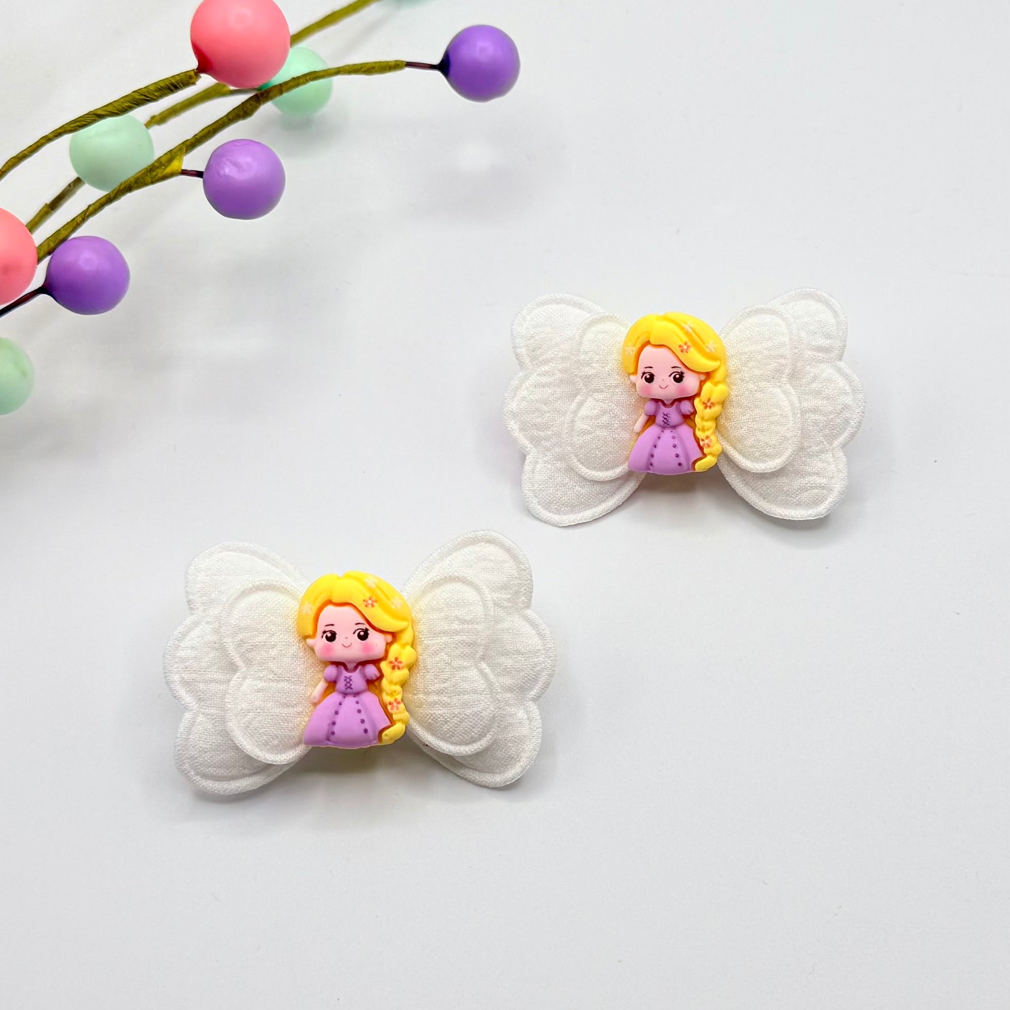A beautiful set of 2 matching hair bows, perfect for pigtails and many other styles. Each with an adorable Embellishment to the centre.