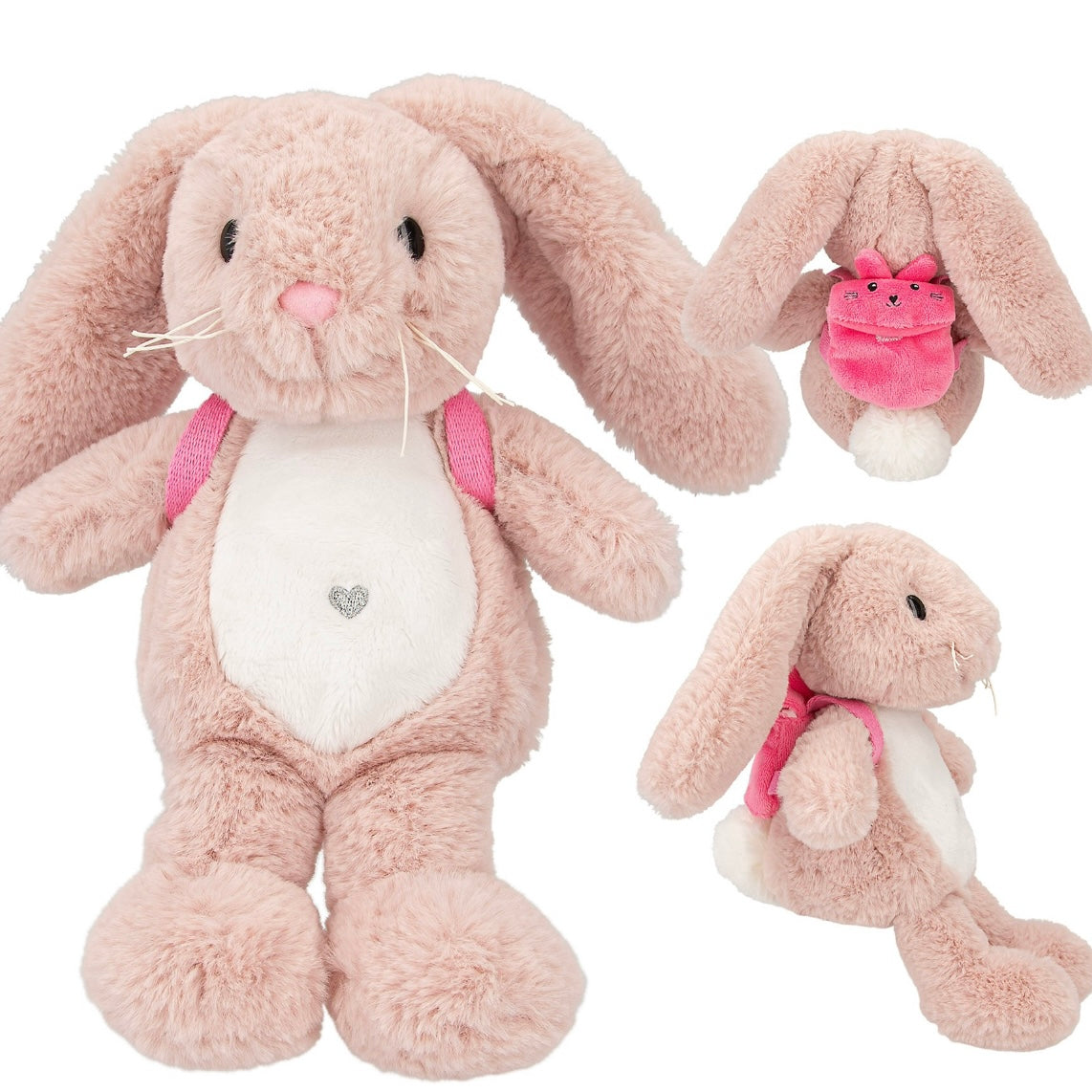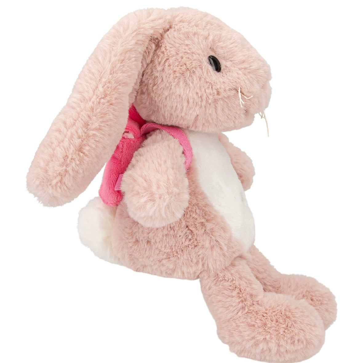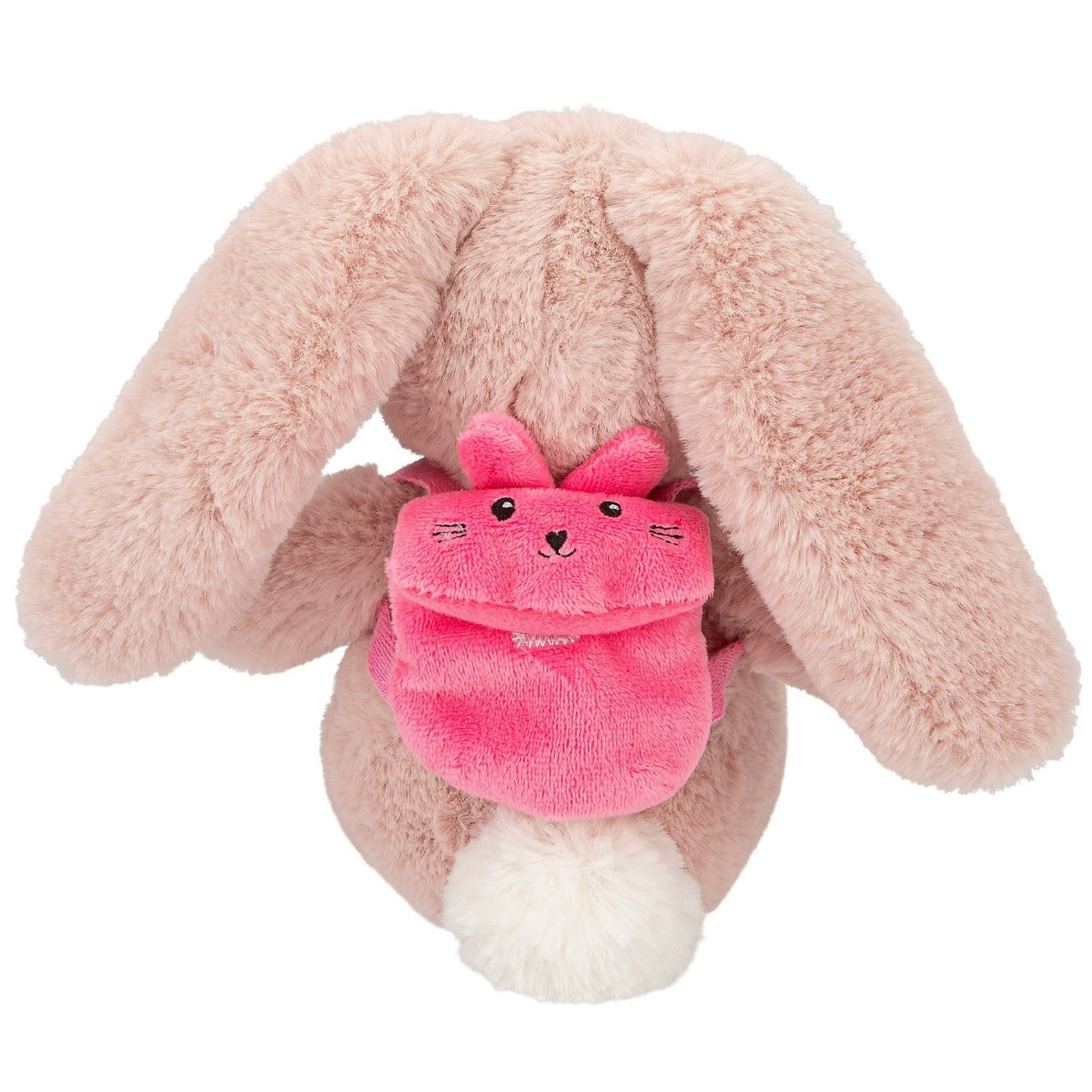 Hoppy sweet packed: the pink bunny Nelly made of cuddly soft plush material carries a small pink plush backpack with a cute embroidered bunny face. Material: 100 percent polyester
