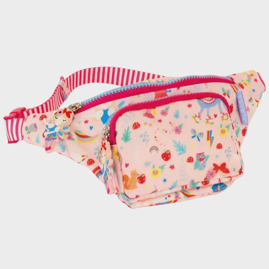 However you choose to style it (across your waist or over your shoulder) our brilliant and bright Belt Bags are perfect for stylish adventurers who want to keep their most precious belongings closeby for safe keeping! Our Rainbow Fairy design has two chunky, fairy shaped zip pulls, two handy compartments and an adjustable strap in a gorgeous striped material. Inside the bag is a lovely Rainbow Fairy print and an ‘I belong to…’ label for personalisation. Our Belt Bags are wipe clean and recyclable. FEATURES Can be worn multiple ways Front pocket with zip Chunky, fun shaped zip pulls ‘I belong to....’ label sewn in on the inside Adjustable strap Wipe clean Eco-friendly Recommended age 3+ DIMENSIONS 29 x 13 x 2cm / 11.4 x 5.11 x 0.78 inches