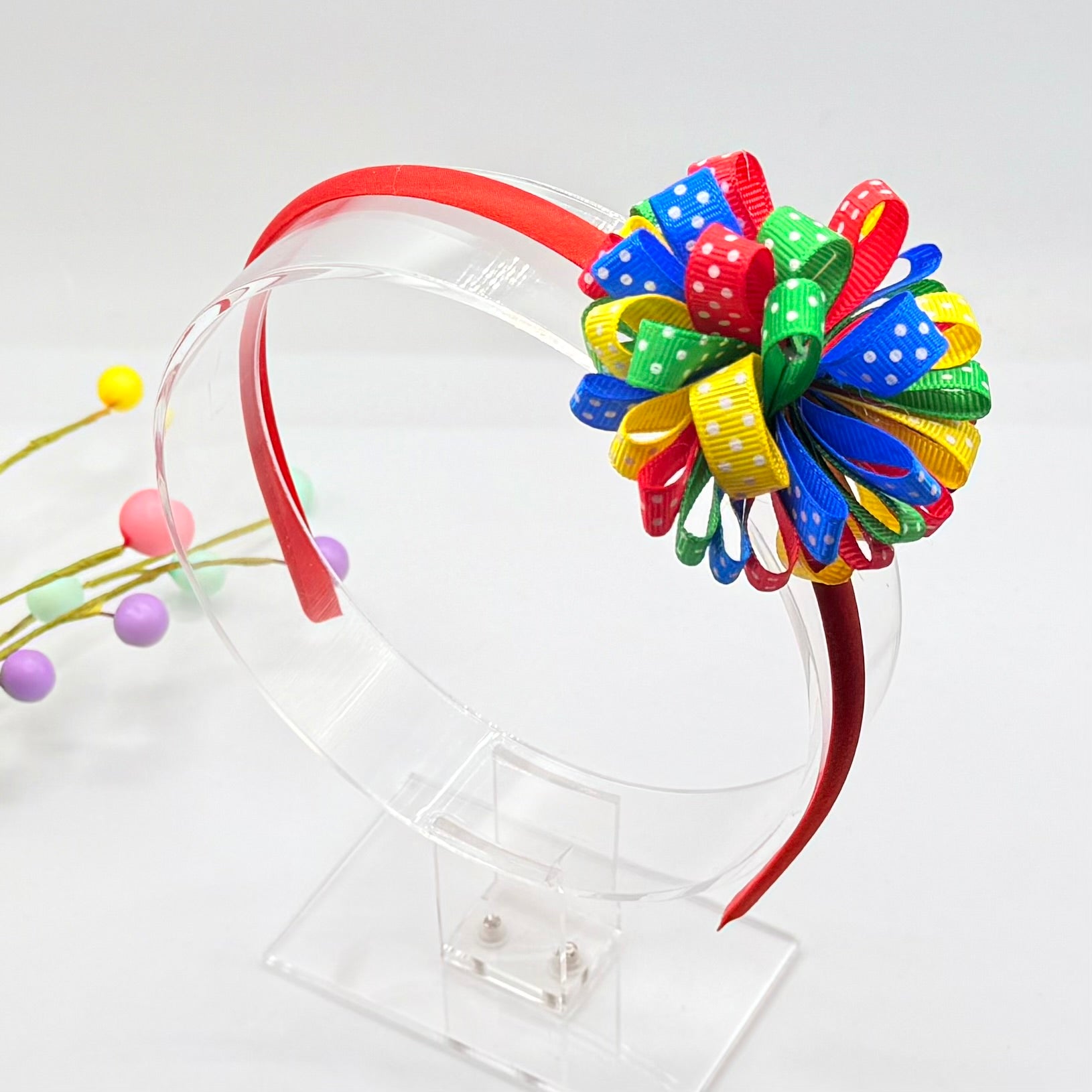 Full of lovely bright coloured ribbons, all looped together and attached to a satin covered Alice style hair band.