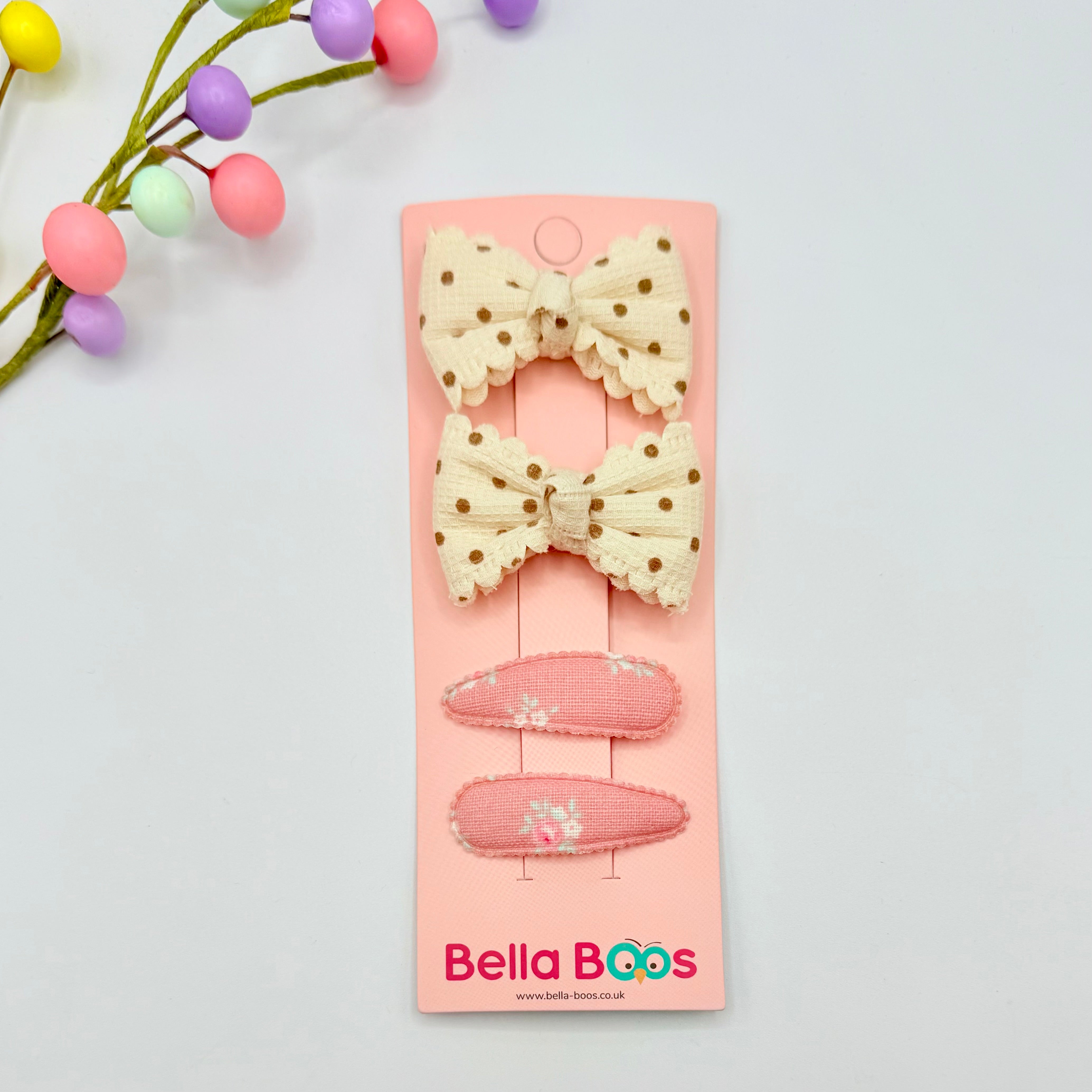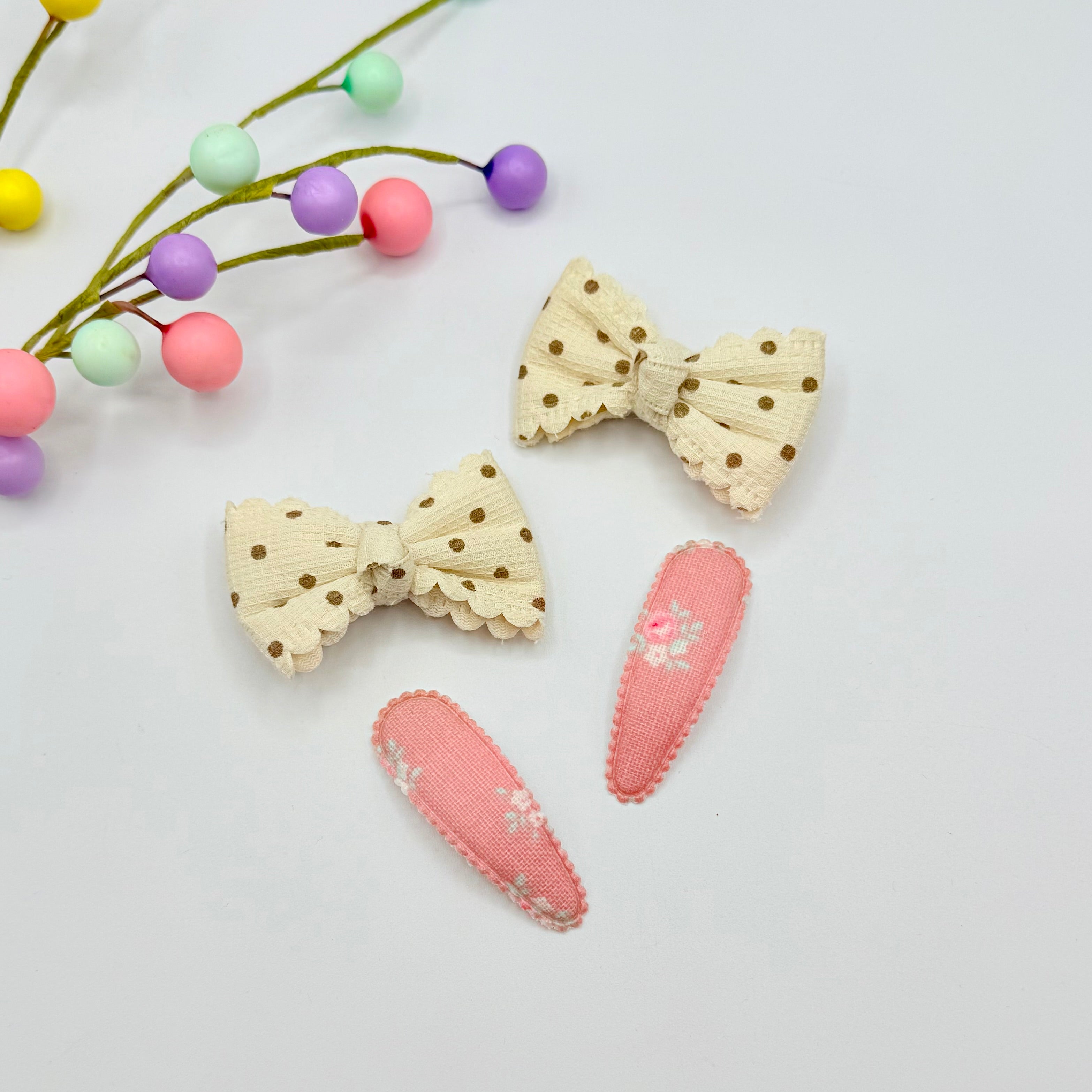 A beautiful set of soft fabric hair bows attached to strong crocodile style clips alongside a pretty pair of matching, fabric covered style snap clips.  Bows are approx 6cm across.