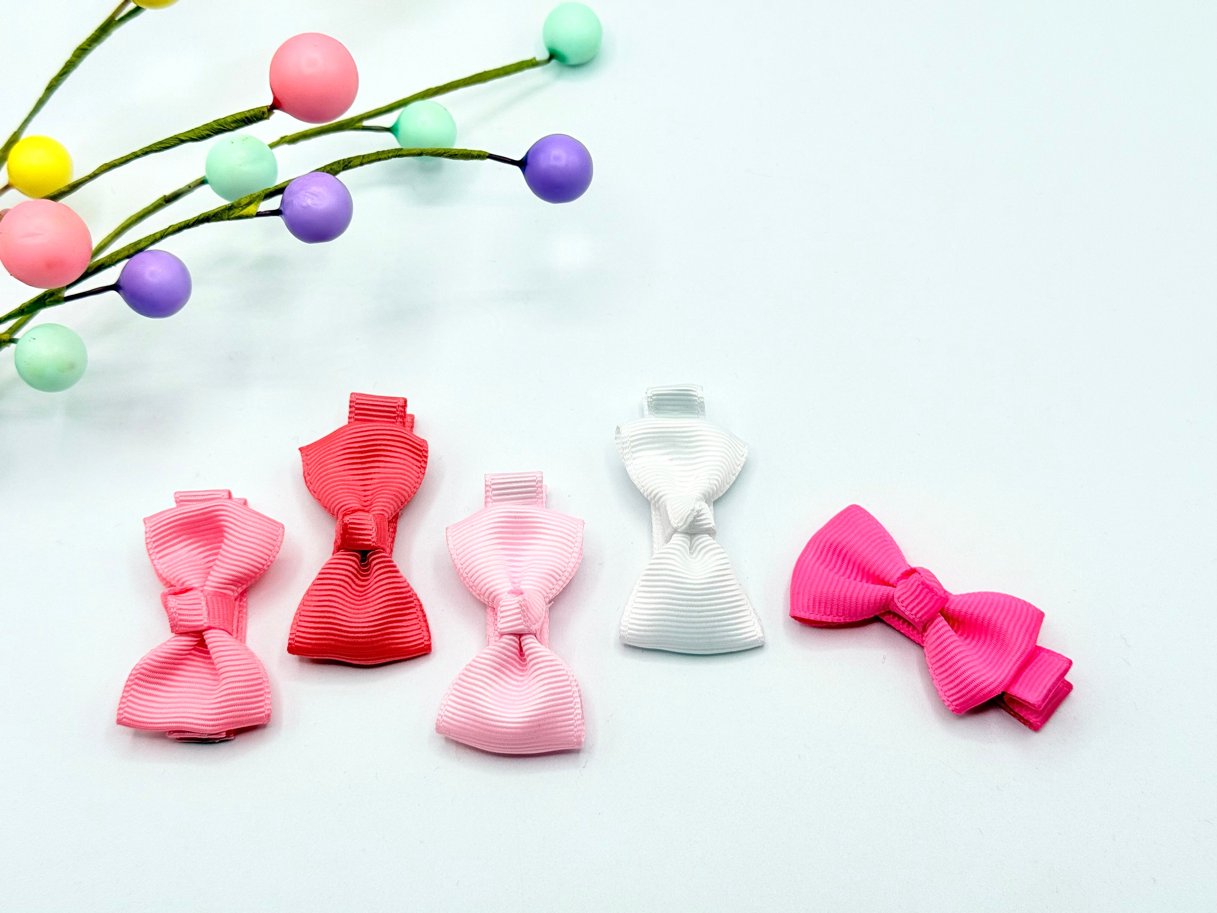 A lovely set of 5 hair bows, in the prettiest of colours. Each is approx 4.5cm.