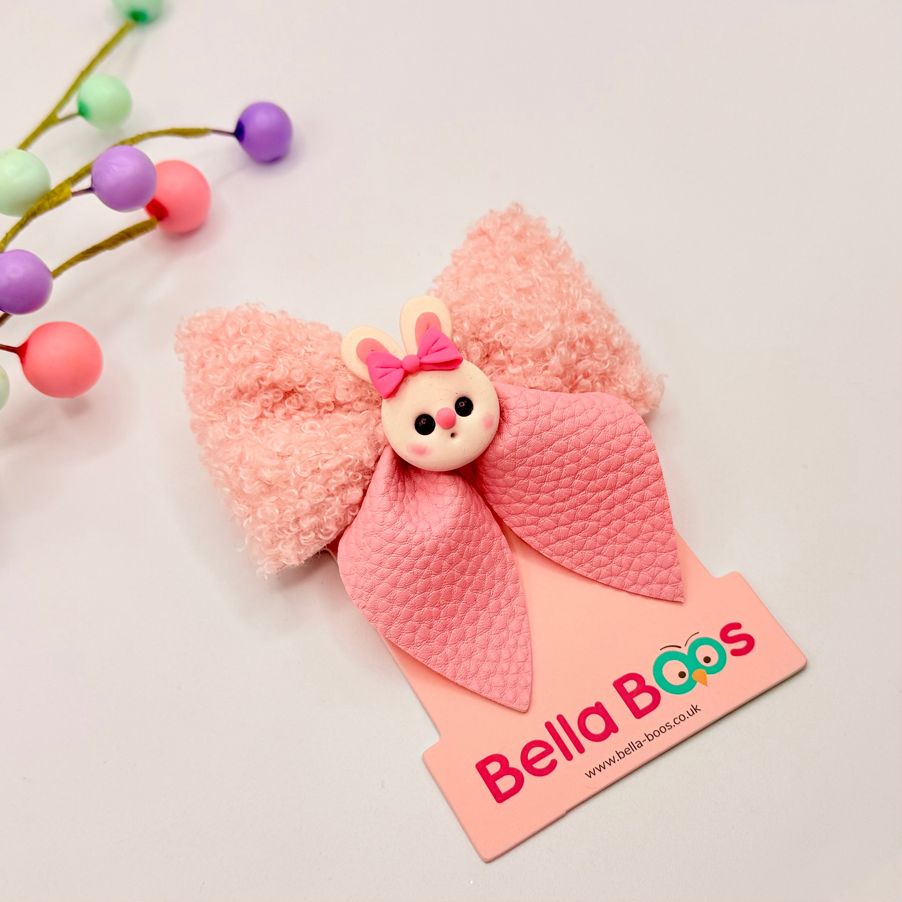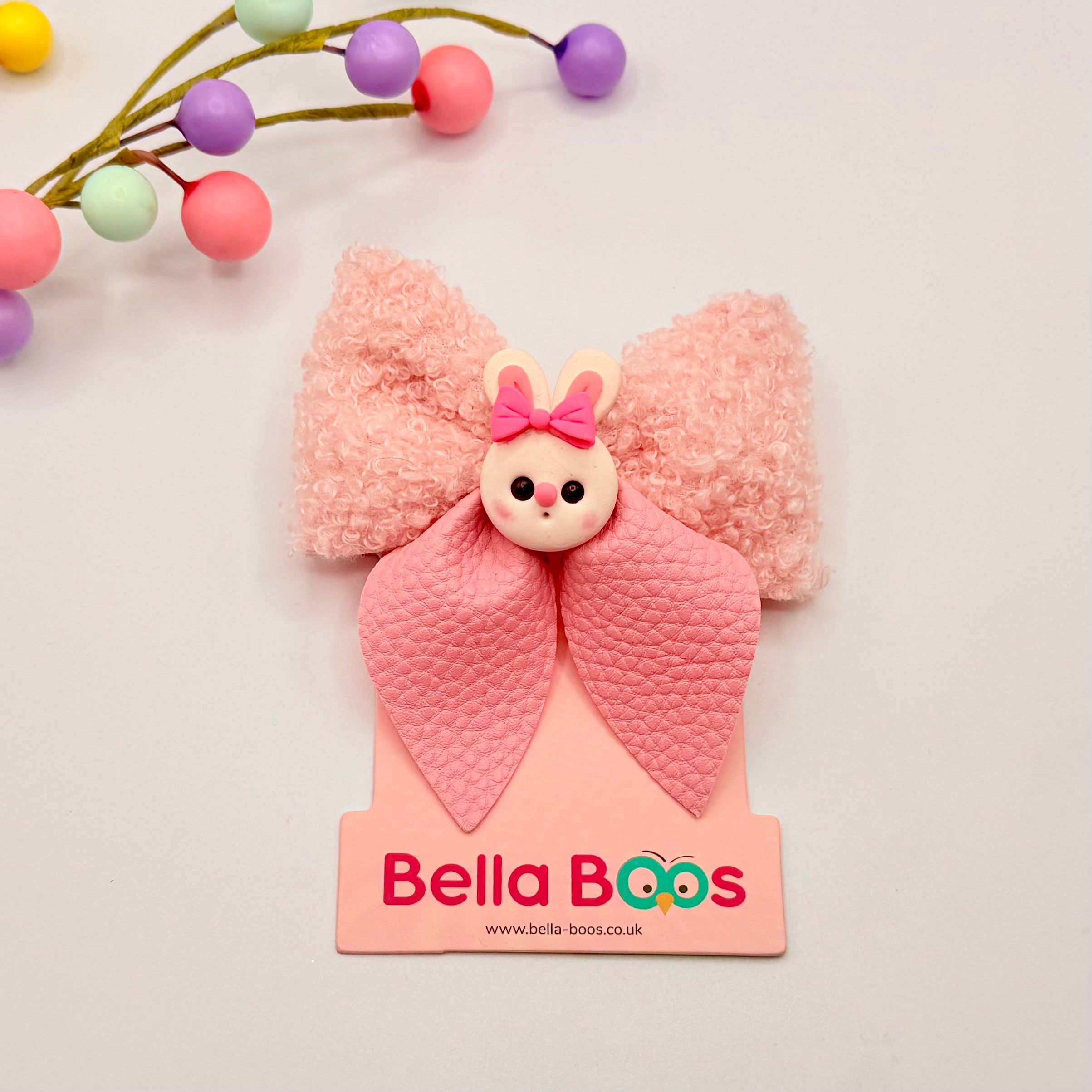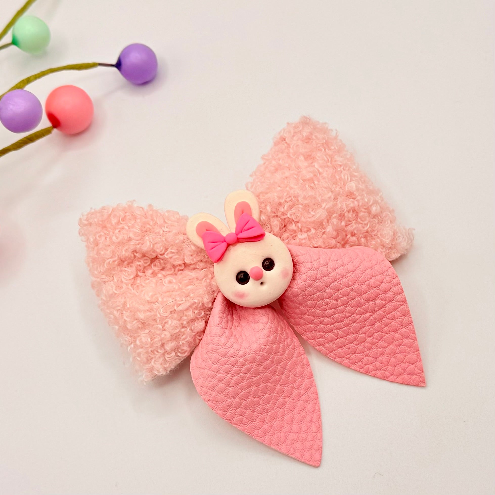 A soft teddy like fabric bow with soft leatherette style tails. Finished with a handcrafted clay Buuny. Size is approx 9 by 9cm.