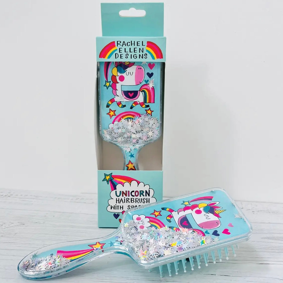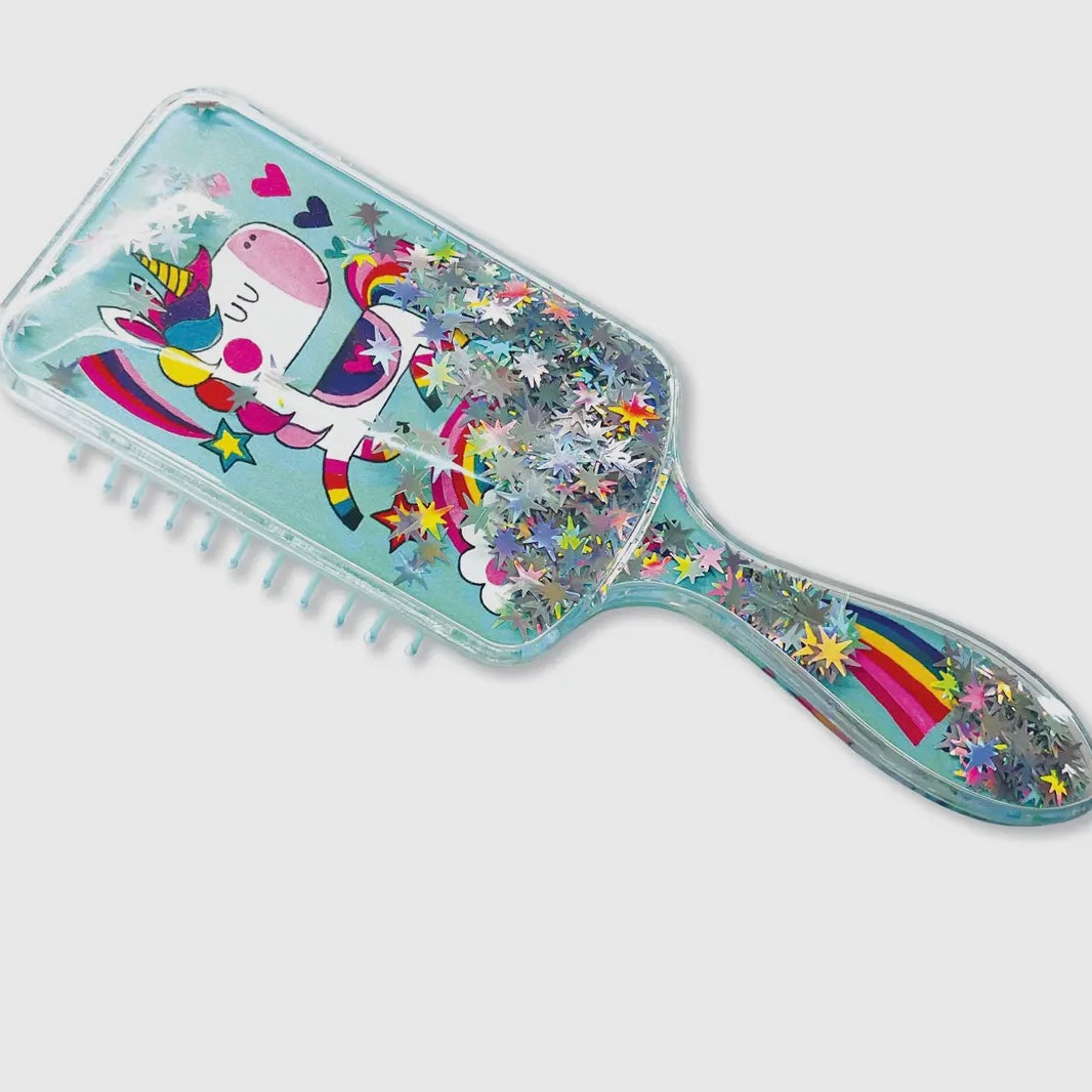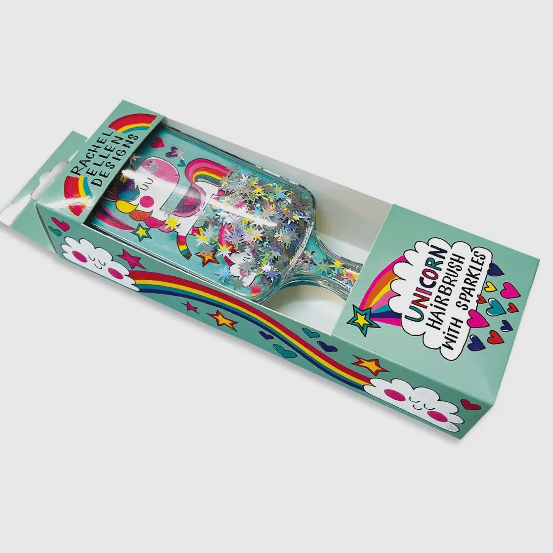 This pretty new Unicorn themed hairbrush is easy to hold, good for detangling hair and has a rubber cushioned base for added comfort. The back of the brush features sparkly holographic stars which move around. Supplied in an attractive co-ordinating box with euro hook. PACKAGING: Cardboard box