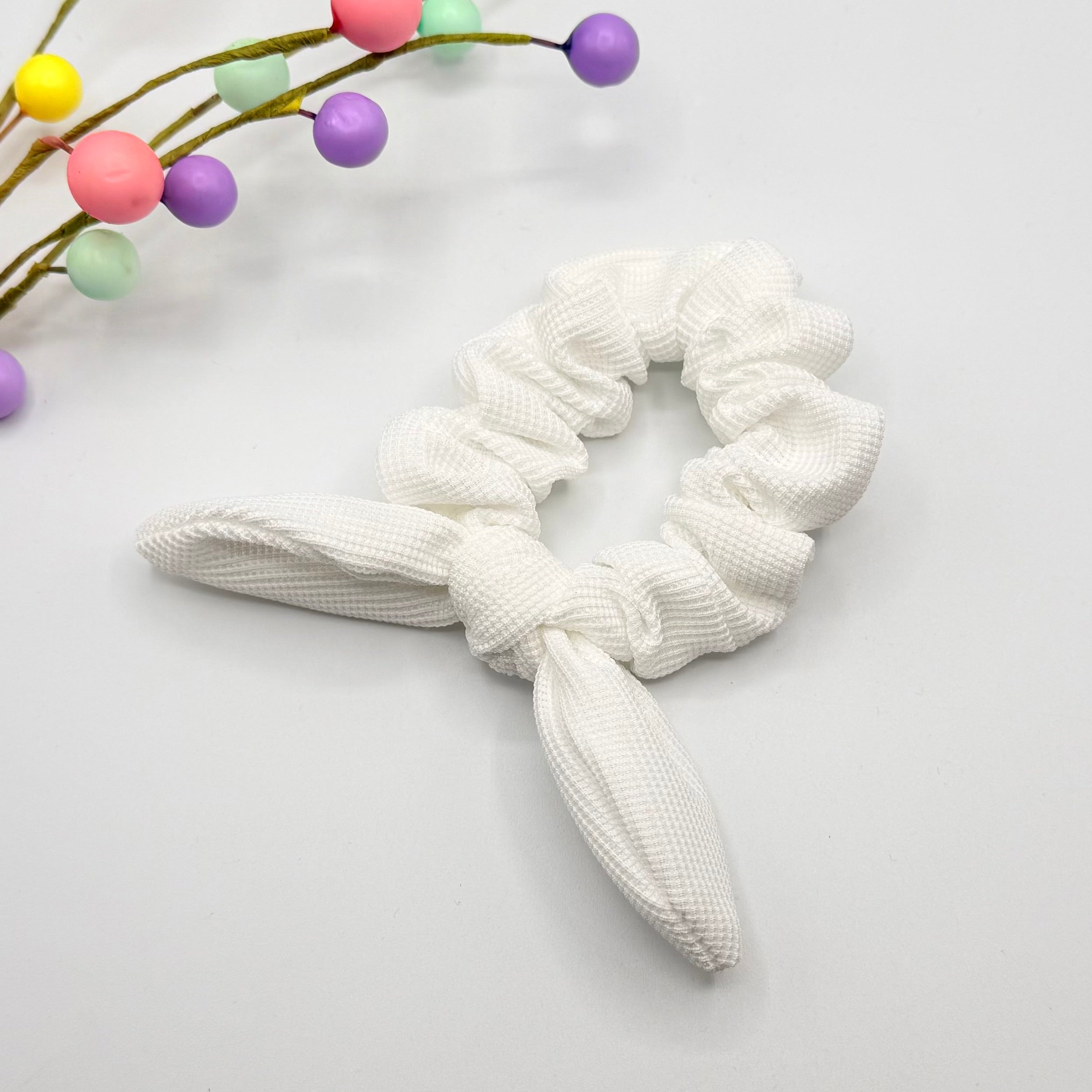 An elasticated hair scrunchie in a woven effect fabric. With added tails.