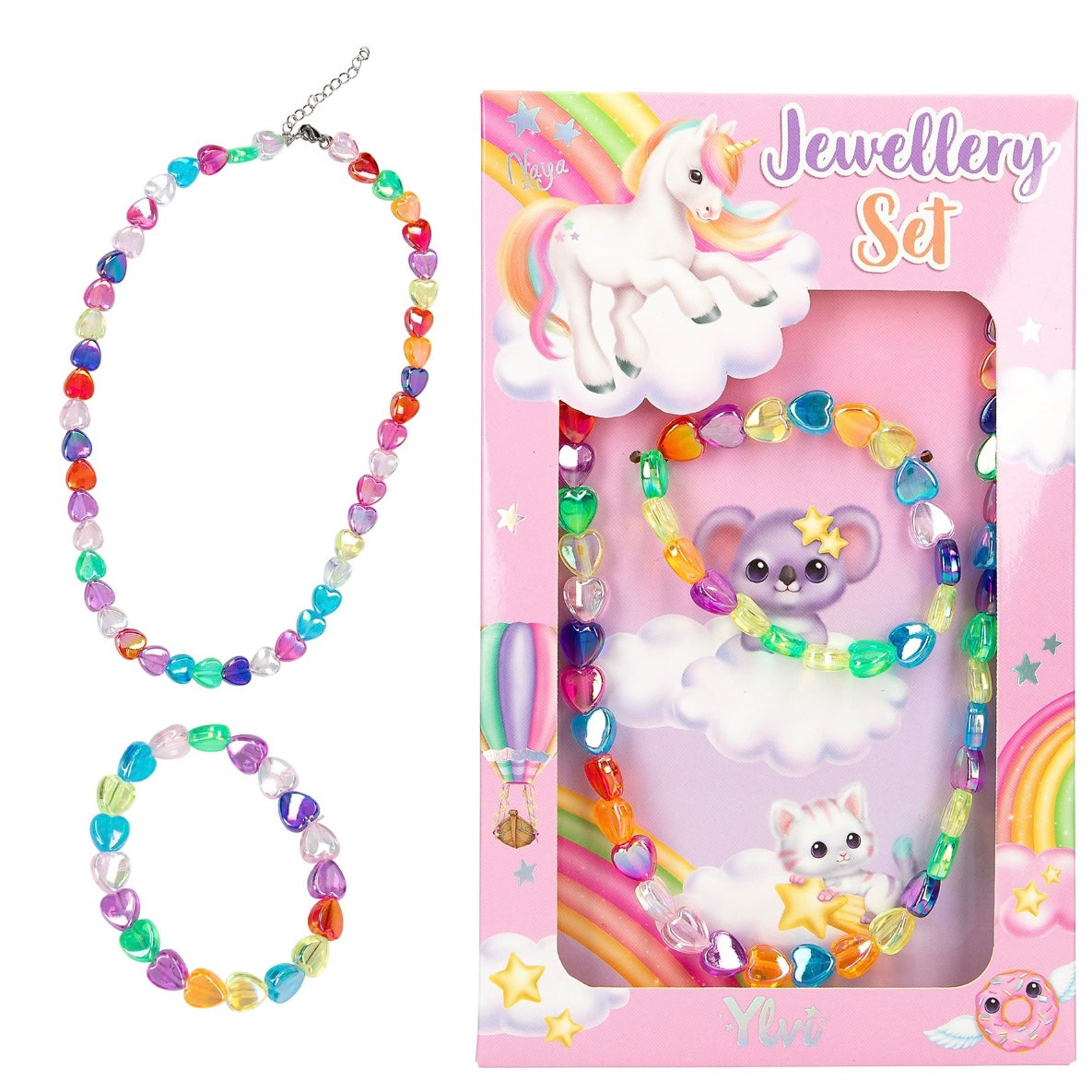 Cute jewellery set from Ylvi: the necklace and bracelet are made entirely of small, colourful plastic hearts that shimmer slightly. The necklace has a metal clasp and is adjustable in length, while the bracelet has an elastic band.